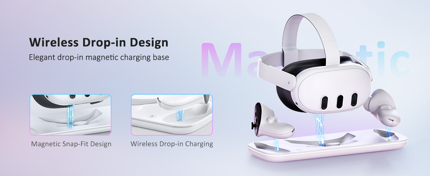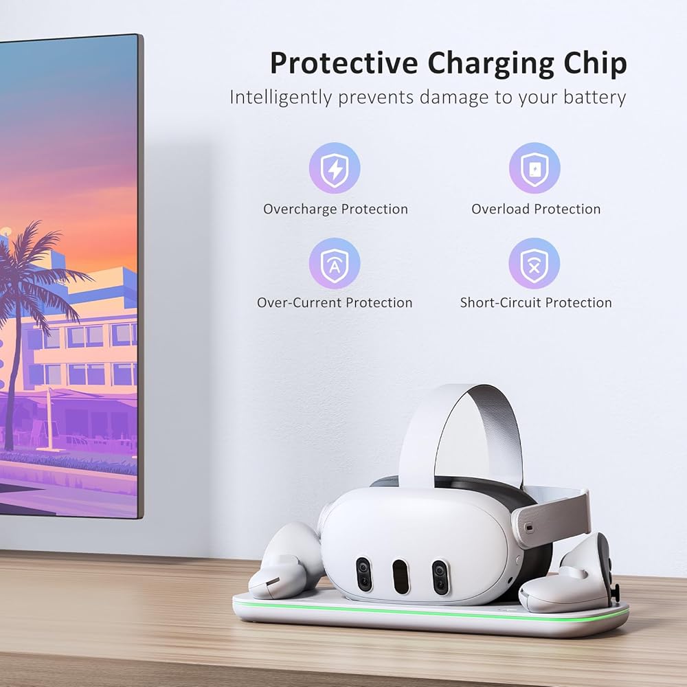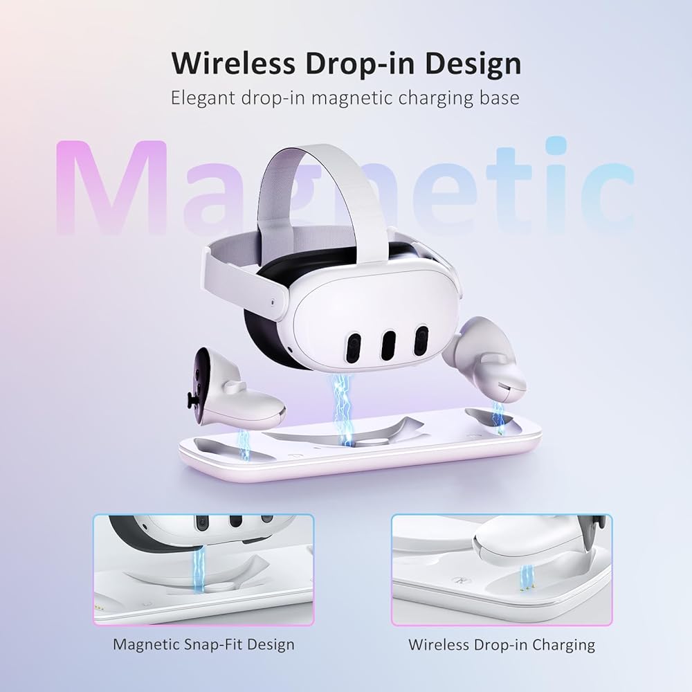 • [تصميم شحن مغناطيسي قوي] استمتع بالتوافق السلس لقاعدة الشحن المطورة هذه مع سماعة الرأس Quest 3 وأجهزة التحكم التي تعمل باللمس. يضمن التصميم المغناطيسي المنسدل وضعًا سهلاً للشحن السريع والموثوق. ما عليك سوى وضع سماعة الرأس ووحدات التحكم الخاصة بك، والاسترخاء، والسماح لها بالشحن بكامل طاقتها، كل ذلك مع الاستمتاع بالحماية المضمنة ضد ارتفاع درجة الحرارة.