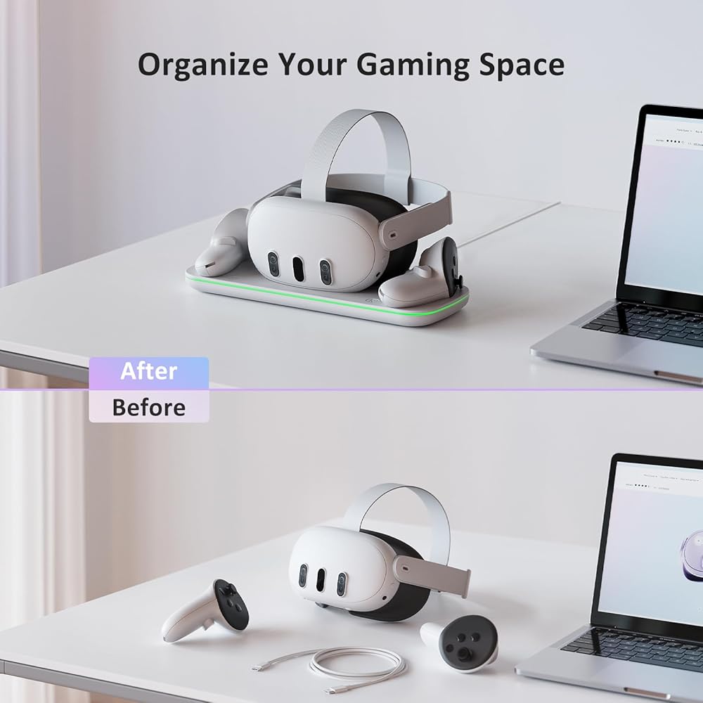 • 【تخزين بأناقة】حامل شحن أنيق وأنيق لجميع ملحقات Oculus 3 الخاصة بك. حافظ على تنظيم سماعات الرأس ووحدات التحكم الخاصة بك بشكل أنيق، مما يضمن وجود منطقة ألعاب نظيفة ومرتبة وجاهزة للعب.