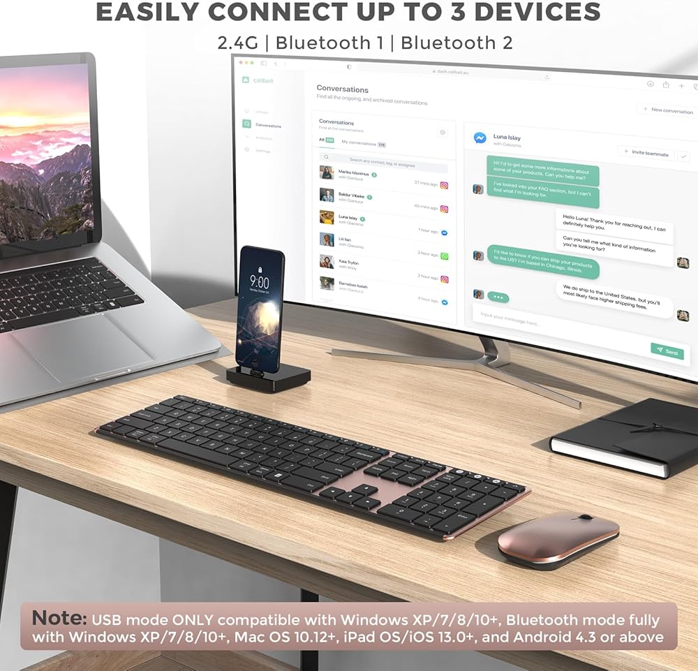 قم بتوصيل ما يصل إلى ثلاثة أجهزة بسهولة: مع خيارات اتصال USB-A وBT 1 وBT 2، يمكنك توصيل ما يصل إلى ثلاثة أجهزة وتبديلها بلمسة زر واحدة. سواء كان جهاز الكمبيوتر المكتبي أو الكمبيوتر المحمول أو الجهاز اللوحي، فإن مجموعتنا ستوفر لك كل ما تحتاجه
