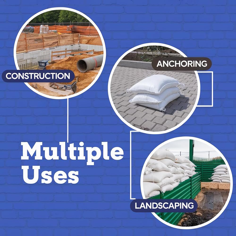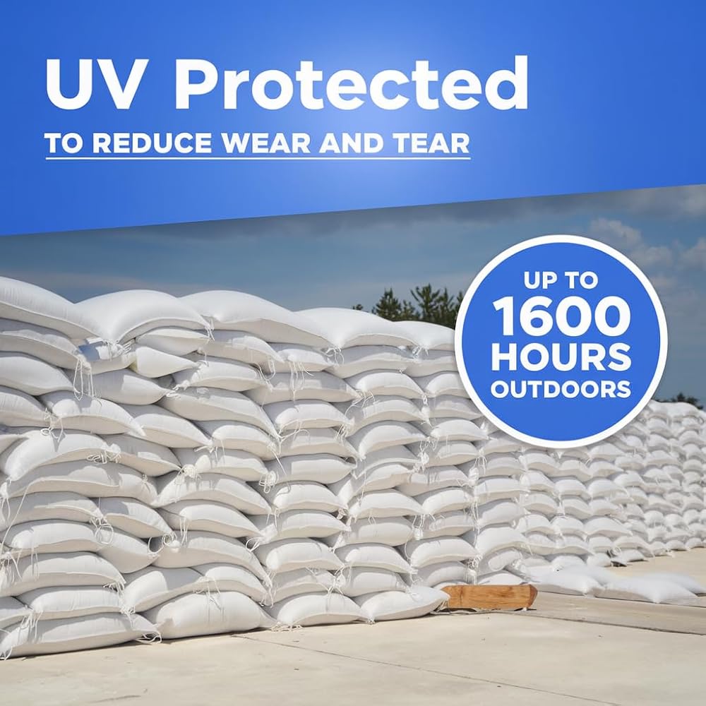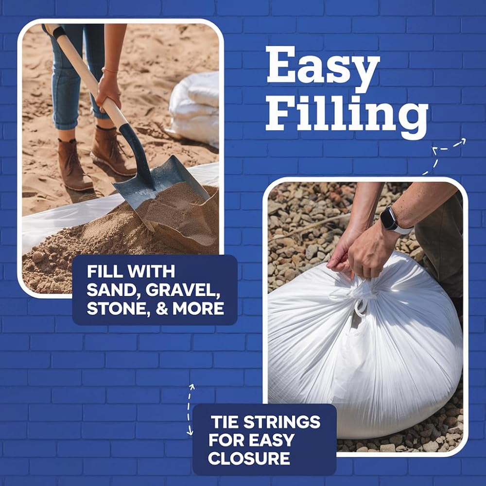 14" x 26" esandbags. empty polypropylene sand bag with loop. esandbags durable and affordable polypropylene bags that have a 50lb weighted capacity and 1600 HR UVI rating in the sun. Durable tubular polyester fabric. The hem at the top makes filling easier and the included strings allow for a strong leak-proof closure. Investing in sandbags is a smart decision for anyone looking to enhance their preparedness and safety in various situations. These versatile bags are designed to withstand challenging conditions, from securing outdoor structures during gusty winds to providing stability for construction projects. Whether you're a homeowner preparing for potential floods or a contractor needing reliable anchoring solutions, sandbags offer a simple yet effective way to safeguard property and equipment. With their durable construction and easy handling, sandbags provide peace of mind and practicality in a wide range of applications, making them an essential addition to any toolkit.