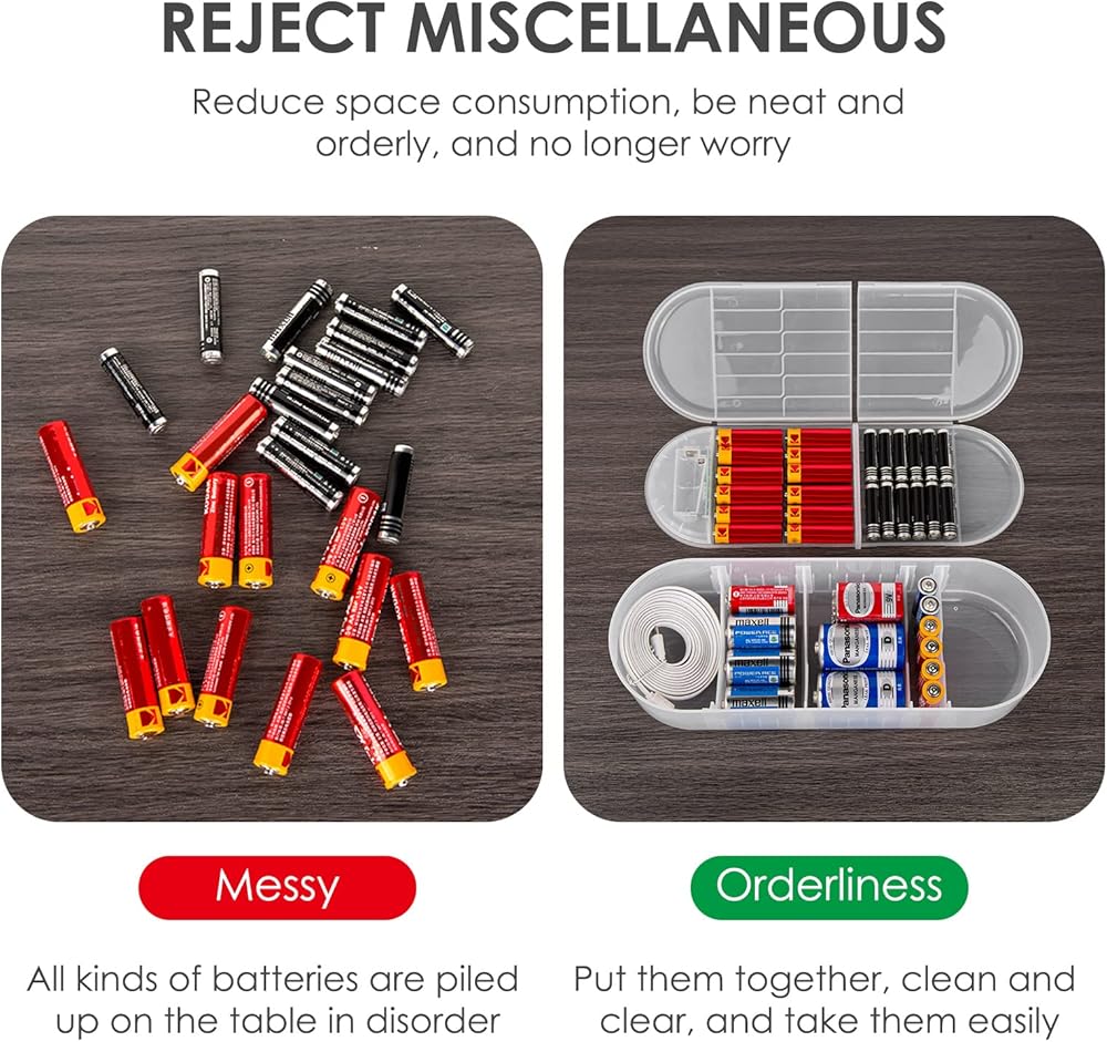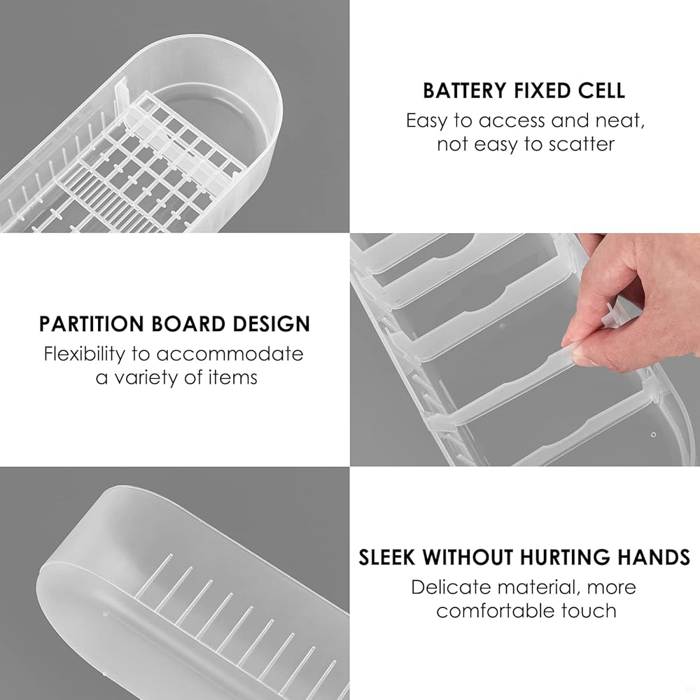 Battery organizer storage case with battery fixing grid, easy to access and neat, not easy to scatter. Partition plate design to accommodate chargers, charging cables, headphones, etc.