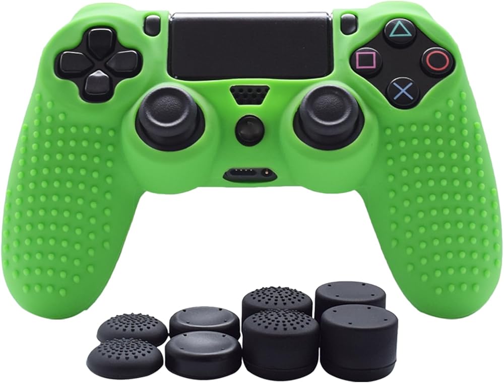 مقابض Jazane متوافقة مع جلد وحدة التحكم PS4، غطاء سيليكون لجهاز PlayStation 4 PS4/Slim/Pro Controller Pack 1 غطاء مضاد للانزلاق - 8 قطع مقابض إبهام - أزرار خضراء