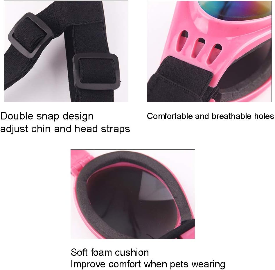 Ensures a comfy fit with adjustable chin and head straps that snap in place snuggly on all doggie head shapes and sizes. Adjustable Range (head):6.5 -13.4inch /16 cm -34 cm. Adjustable Range (lower jaw): 7.5 -15inch/19 cm -38 cm, that makes the goggle suitable for most dogs including the big and small ones without making your pets uncomfortable