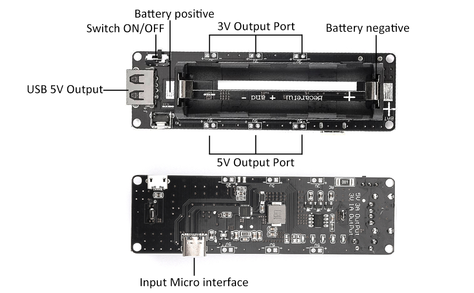 • يدعم مخرجين للجهد 3 فولت/1 أمبير و5 فولت/2.2 أمبير. التيار المقنن لإخراج الجهد الكهربي 5 فولت هو 2.2 أمبير، والحد الأقصى للتيار المدعوم هو 3 أمبير (لا يُنصح بالتحميل الزائد، مما سيتلف الوحدة بسهولة ويسرع عمر الخدمة).
