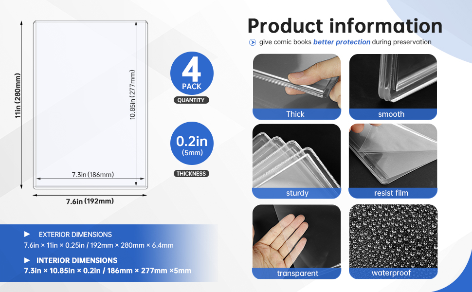 الميزات: تتميز أغلفة عرض الكتب الهزلية لدينا بأنها شفافة وقوية ومقاومة للماء وليس من السهل الانحناء، مما يمكن أن يمنح الكتب الهزلية حماية أفضل أثناء الحفظ والعرض والنقل، ويمكنك أيضًا استخدامها مع الحقائب الهزلية لتأثير الختم. يرجى تمزيق الطبقة الواقية الشفافة من كلا الجانبين قبل الاستخدام