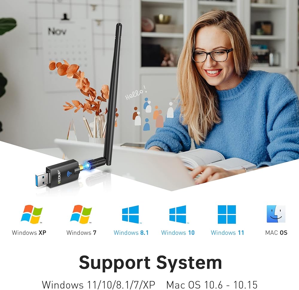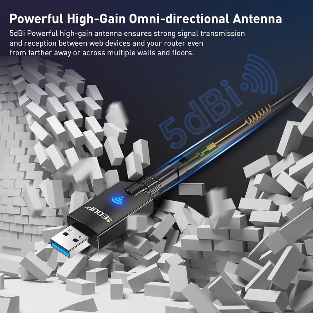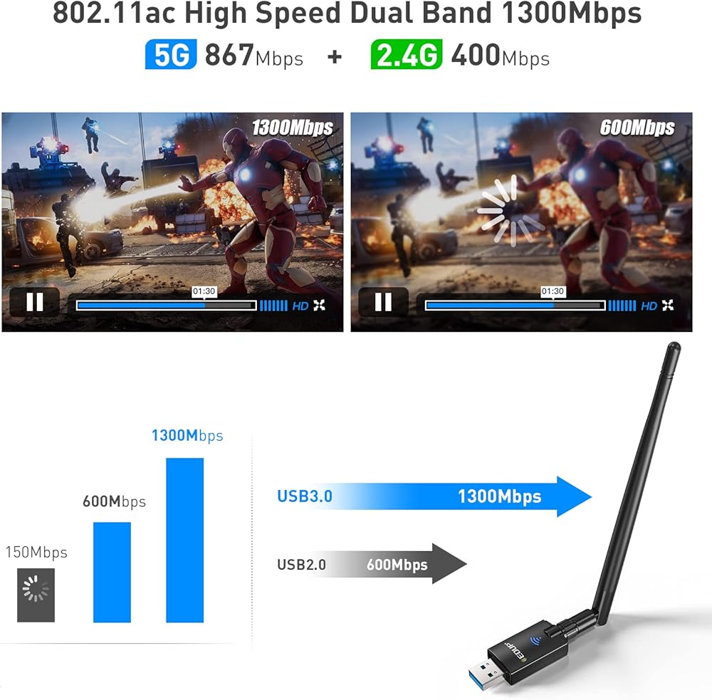 【أداء ثابت】 - مع هوائي 5dBi، يوفر المحول اللاسلكي سرعات واي فاي تصل إلى 1300 ميجابت في الثانية في قوة الإشارة، ومتوسط سرعة التحميل والقراءة ويضمن الهوائي نطاق اتصال Wi-Fi ممتد وثبات فائق على سطح المكتب والكمبيوتر المحمول.
