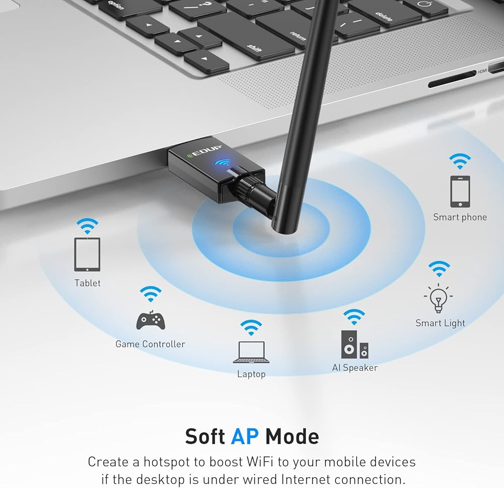 【USB 3.0 وناعم - AP】- يمكن لمحول USB 3.0 واي فاي نقل البيانات حتى 5 جيجابت في الثانية، وهو متوافق مع USB 2.0 و1.1؛ Soft - يمكن لـ AP مشاركة الإنترنت في أجهزة أخرى مع أجهزة أخرى، مما يوفر متعة لاسلكية.