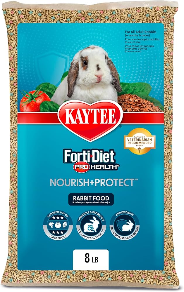 تم تطوير طعام Kaytee Forti-Diet Pro Health Adult Rabbit من قبل خبير تغذية حيواني لضمان حصول حيوانك الأليف على التغذية المناسبة. يحتوي Forti Diet Pro Health على البروبيوتيك والبريبايوتكس لدعم صحة الجهاز الهضمي. هذا الطعام غني بمضادات الأكسدة الطبيعية للصحة العامة والدعم المناعي بالإضافة إلى أنه يحتوي على بعض القطع الأكبر حجمًا والأكثر مقرمشة لدعم صحة الأسنان من خلال نشاط المضغ الطبيعي.