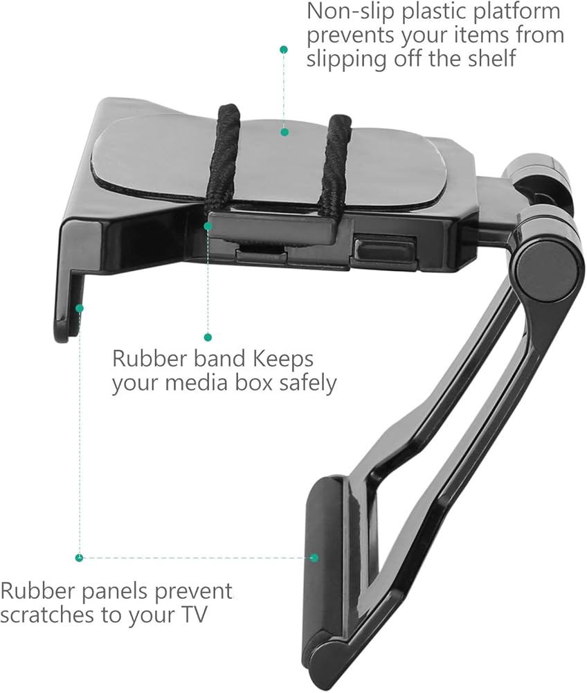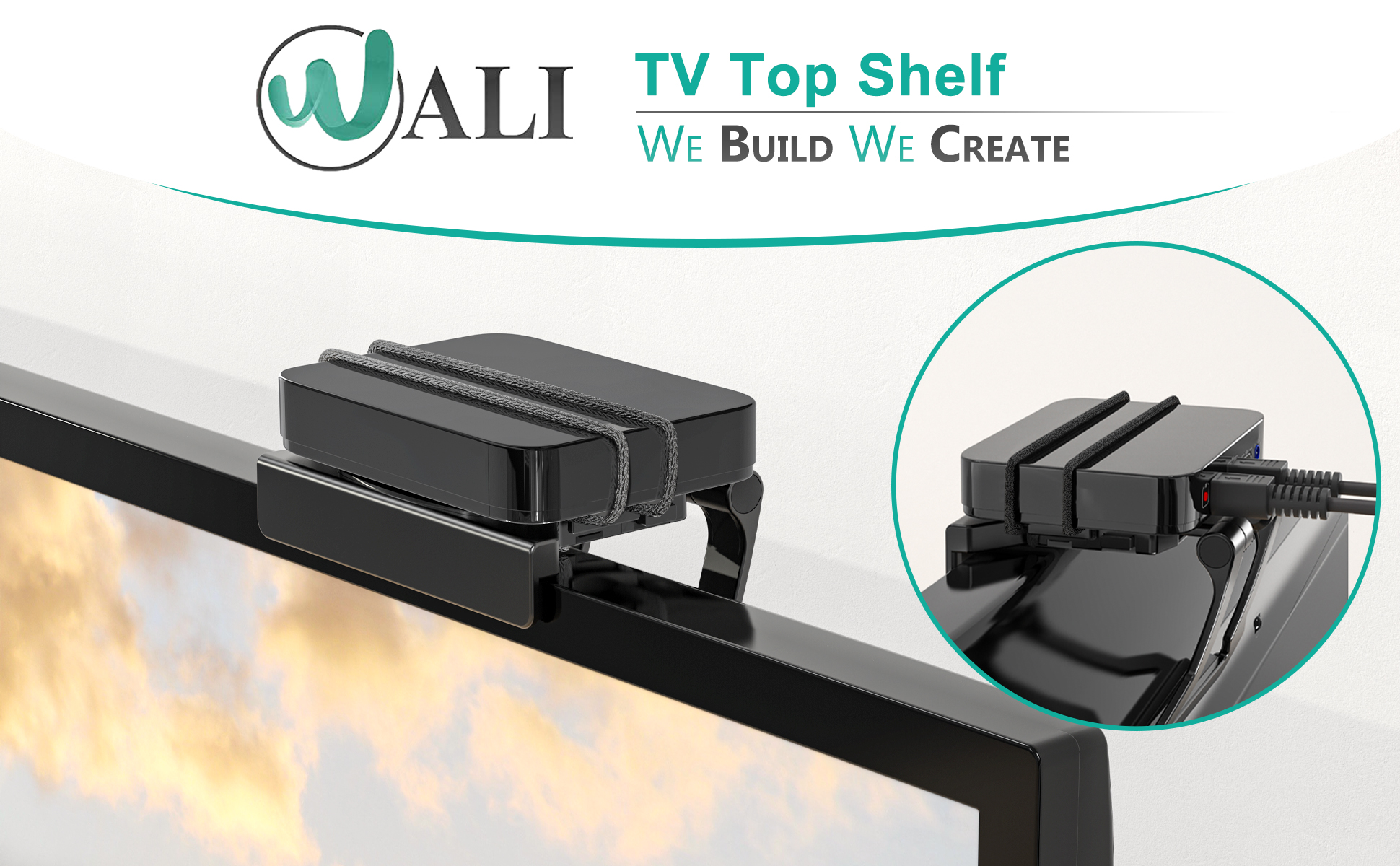 Product Specifications: 5-inch wide flat panel TV top shelf clip mount holder create extra space on top of your TV. Safely holds up to 9lbs (4kg). No assembly required. Installation requires no tools. Retractable platform for holding various devices. Soft fabric prevents scratches to your TV. Perfect for placing streaming devices, wireless speakers, gaming consoles, media boxes, remotes, pictures, plants and more. Package Includes: 1 x WALI 5inch TV Top Shelf Clip Mount Holder