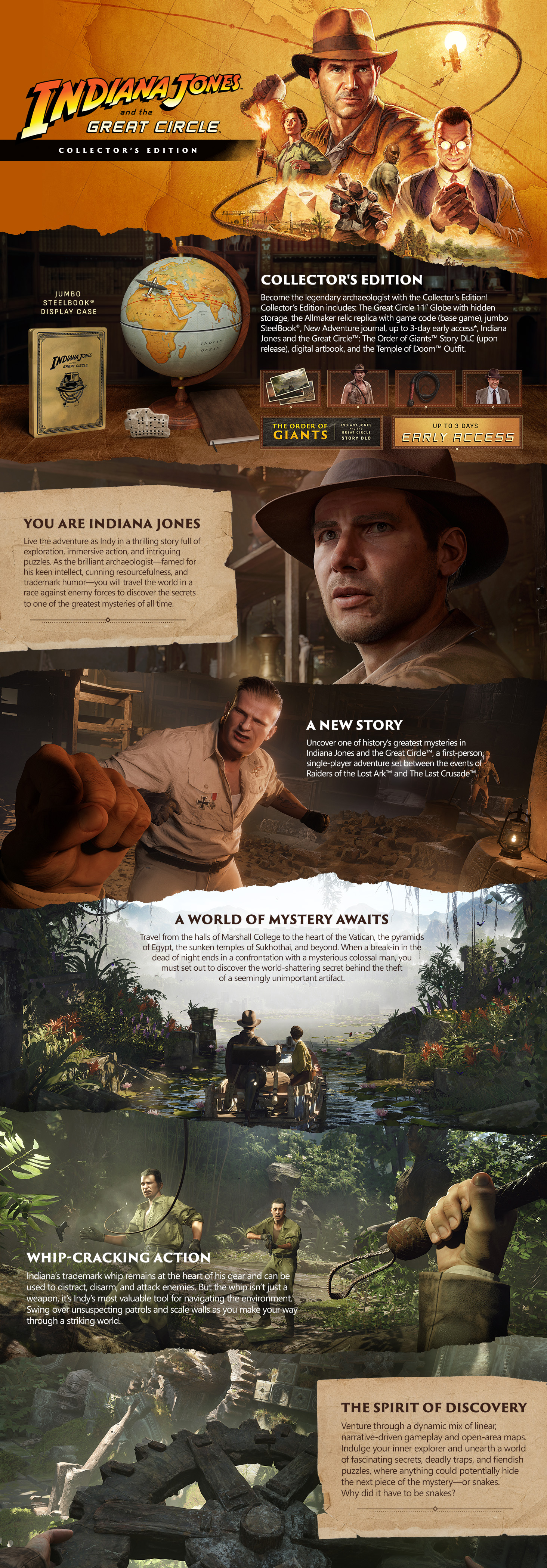 The Collector's Edition includes the Allmaker relic replica with game code (base game), The Great Circle 11” Globe with hidden storage, New Adventure journal, jumbo SteelBook, Indiana Jones and the Great Circle: The Order of Giants Story DLC (upon release), digital artbook, and the Temple of Doom Outfit.