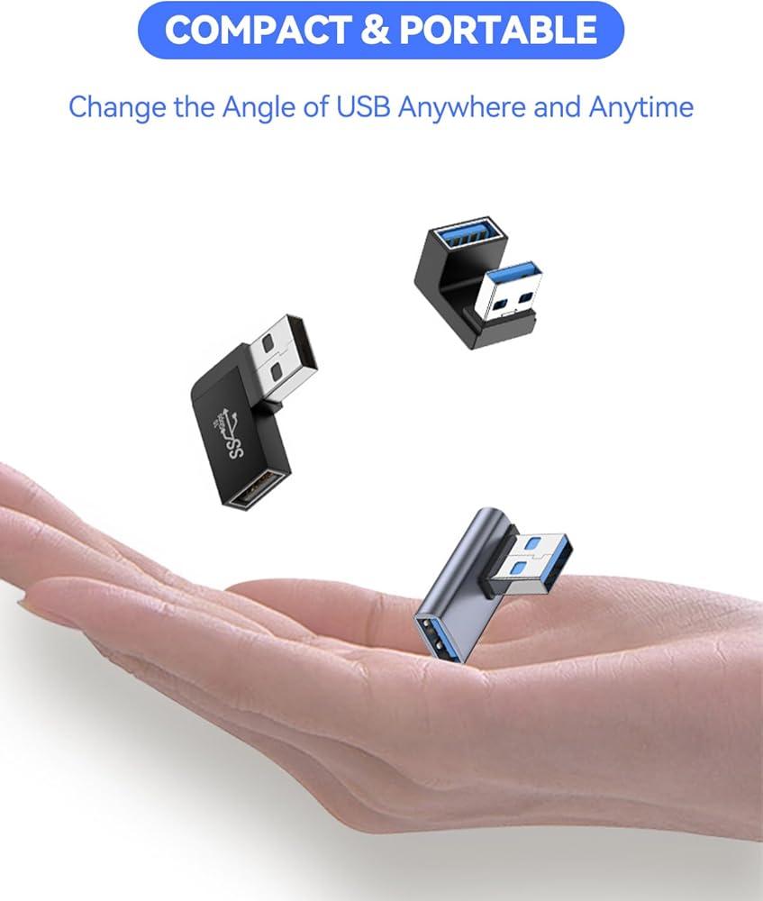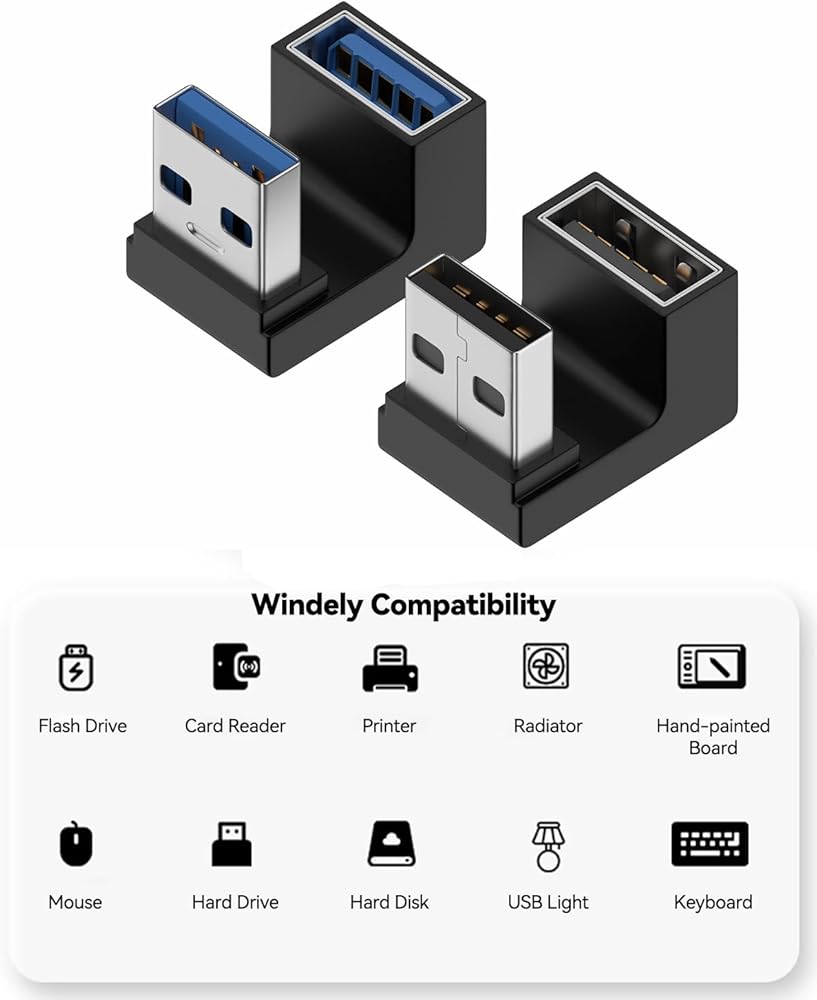 USB right angle adapter compatible with PC, laptop, computer, USB A charger, mouse, keyboard, speaker, flash drive, hard drive and more. Just Plug and Extended your USB port immediately.