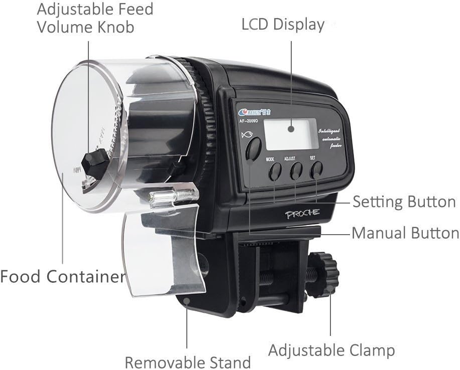 ☞ 4 أوقات للتغذية: ما يصل إلى 4 مرات تغذية في اليوم و1-2 دورة في كل مرة. سهل الإعداد فقط اتبع دليلنا وستجد أنه من السهل ضبط 4 مرات تغذية على الجهاز. اختر أوقات التغذية بنفسك. كما تحتوي وحدة التغذية على زر "يدوي"، استمتع عند إطعام الأسماك بنفسك.