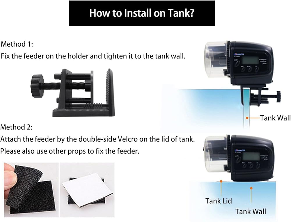 ☞طريقتان للتركيب: يحتوي جهاز التغذية على طريقتين للتركيب لتختار من بينها. الأول هو تثبيت وحدة التغذية على جدار الخزان باستخدام الحامل. آخر هو لصق وحدة التغذية بملصق مزدوج الجانب على غطاء الخزان. تأكد من أن وحدة التغذية يمكن أن تكون فوق مستوى الماء للحفاظ على طعام السمك جافًا.