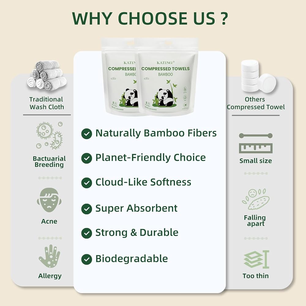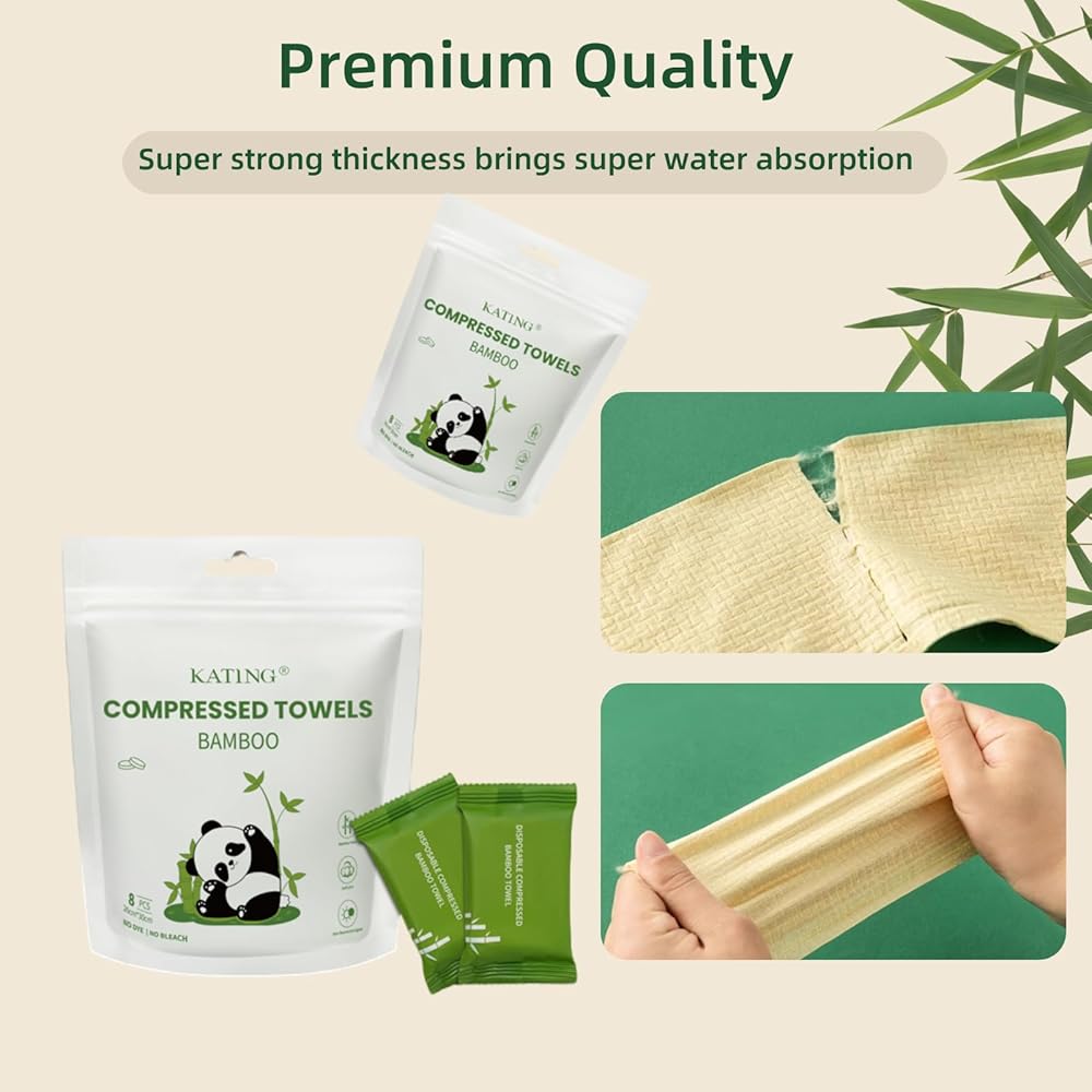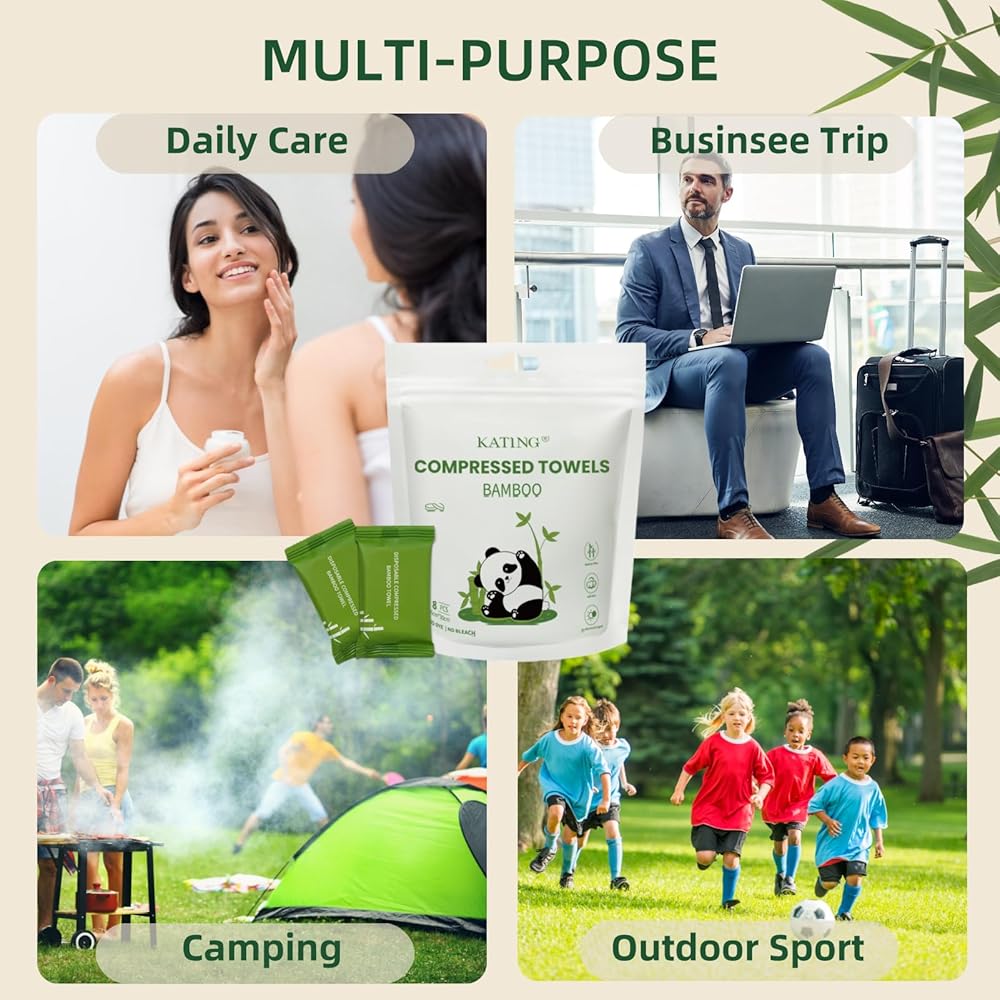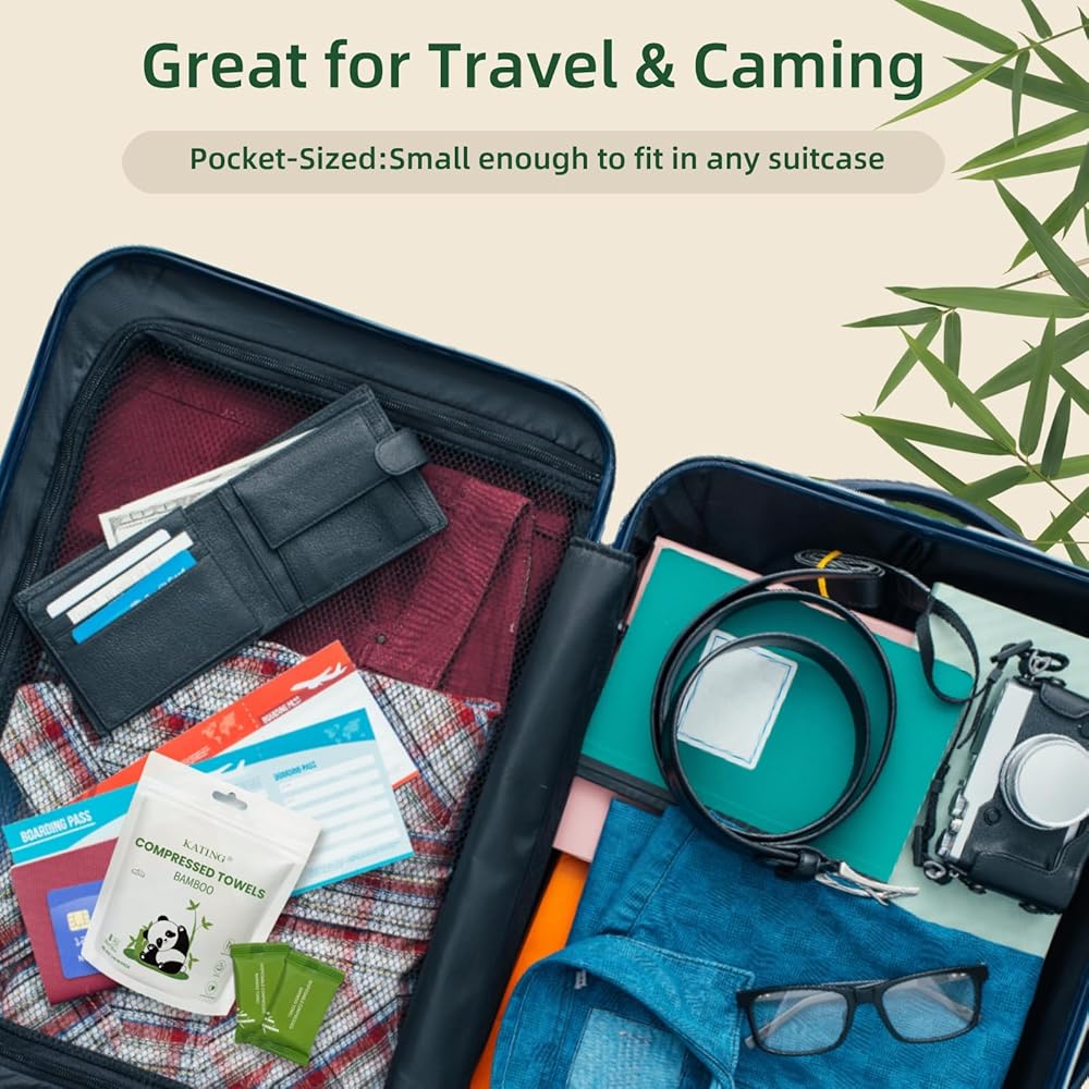 محمولة ومناسبة للسفر: مناشف مضغوطة صغيرة الحجم وملفوفة بشكل فردي، تناسب السفر في أي حقيبة أو جيب. فقط أضف الماء لتوسيعها إلى مناشف كاملة الحجم، مثالية للراحة أثناء التنقل.