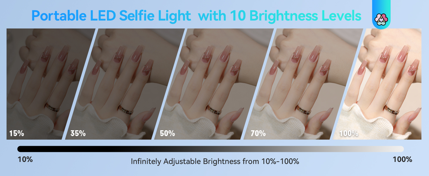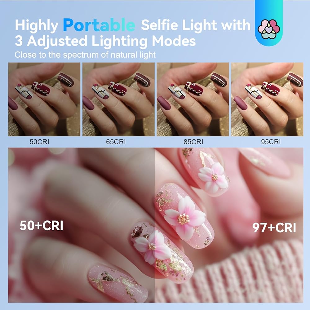 فائقة السطوع مع 3 أوضاع إضاءة و10 مستويات سطوع: قل وداعًا لصور فن الأظافر ذات الإضاءة الخافتة وغير الجذابة. يتميز مصباح السيلفي LED المحمول الخاص بنا بـ 70 خرزة كشاف COB عالية الجودة تستخدم في الأفلام والتلفزيون. مع 3 أوضاع إضاءة (أبيض وطبيعي ودافئ) و10 مستويات سطوع من 10% إلى 100%، يمكنك تخصيص الإضاءة الخاصة بك للحصول على صور مثالية وطبيعية لفن الأظافر. يضمن مؤشر CRI العالي الذي يزيد عن 95 الحصول على ألوان واقعية، مما يجعل ظلال طلاء أظافرك بارزة