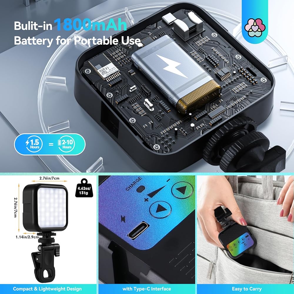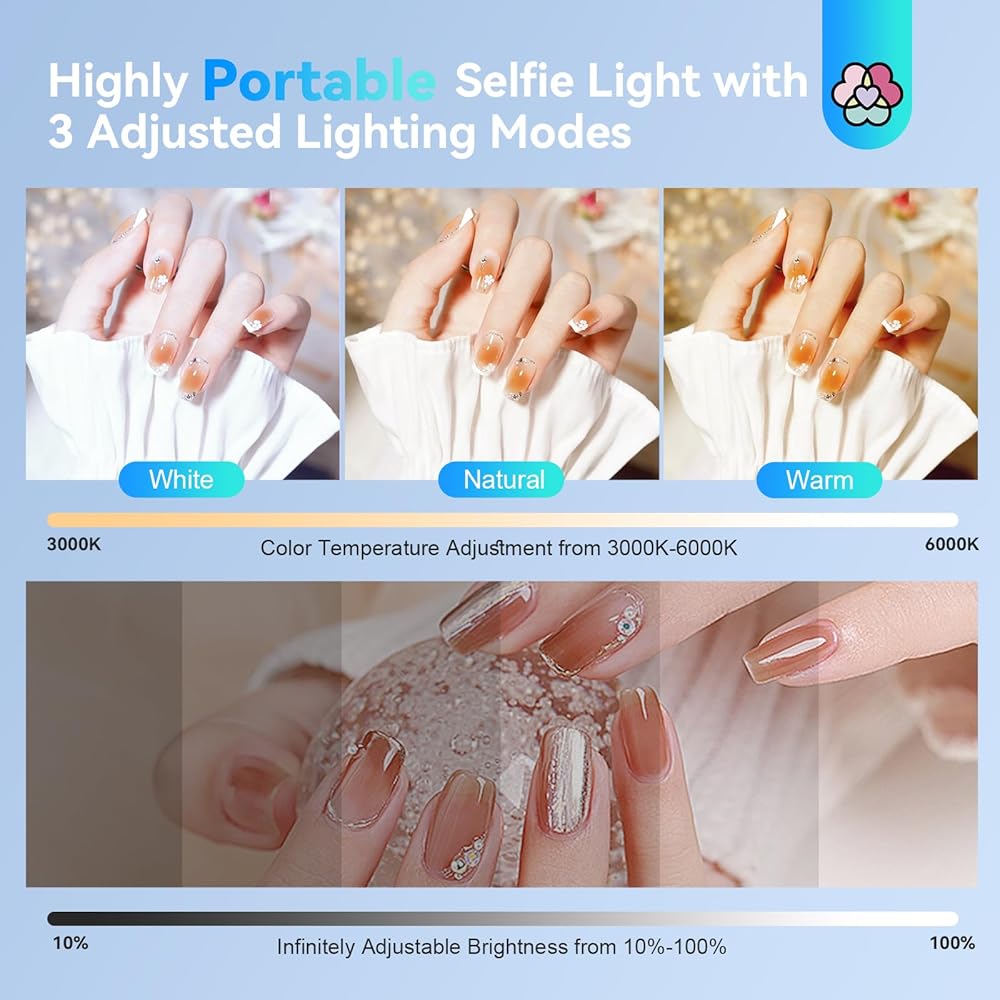 محمول وقابل لإعادة الشحن: التقط الصور أو مدونة الفيديو أو البث المباشر في أي وقت وفي أي مكان. يحتوي مصباح السيلفي المزود بمشبك على بطارية قوية بقوة 1800 مللي أمبير في الساعة، ويتم شحنها بالكامل خلال 1.5 ساعة فقط لمدة 2-10 ساعات من الاستخدام المتواصل. مثالي لمنشئي المحتوى والمؤثرين أثناء التنقل. يزن 131 جرامًا فقط، ويمكن وضعه بسهولة في حقيبتك، مما يسمح لك بالتقاط رسومات أظافرك أينما كنت