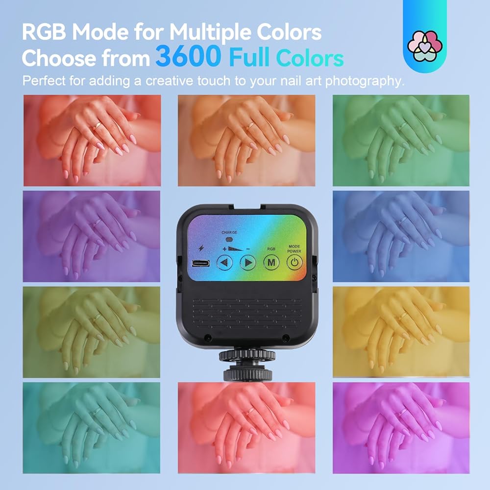 وضع RGB مطور لألوان متعددة: اختر من بين مجموعة واسعة من الألوان لإضافة المزيد من المشاهد والواقعية إلى مقاطع الفيديو والصور الخاصة بك، ومحاكاة سيناريوهات مختلفة. مثالي لمطابقة مزاج تصميمات أظافرك وإضافة لمسة إبداعية لتصوير فن الأظافر الخاص بك
