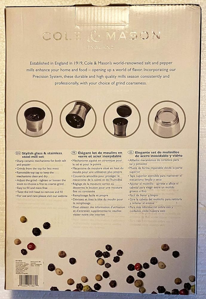 The spice mills feature Cole & Mason's proprietary ceramic grinding mechanism that promises the perfect grind every time. Be it coarse sea salt or delicate peppercorns, the spice mill grinds them effortlessly, enhancing the flavor of your meals. This grinder salt and pepper mill set is crafted from durable stainless steel and soda lime glass, ensuring long-lasting use. The stainless steel components add a modern touch, while the soda lime glass offers a clear view of the spices contained within.