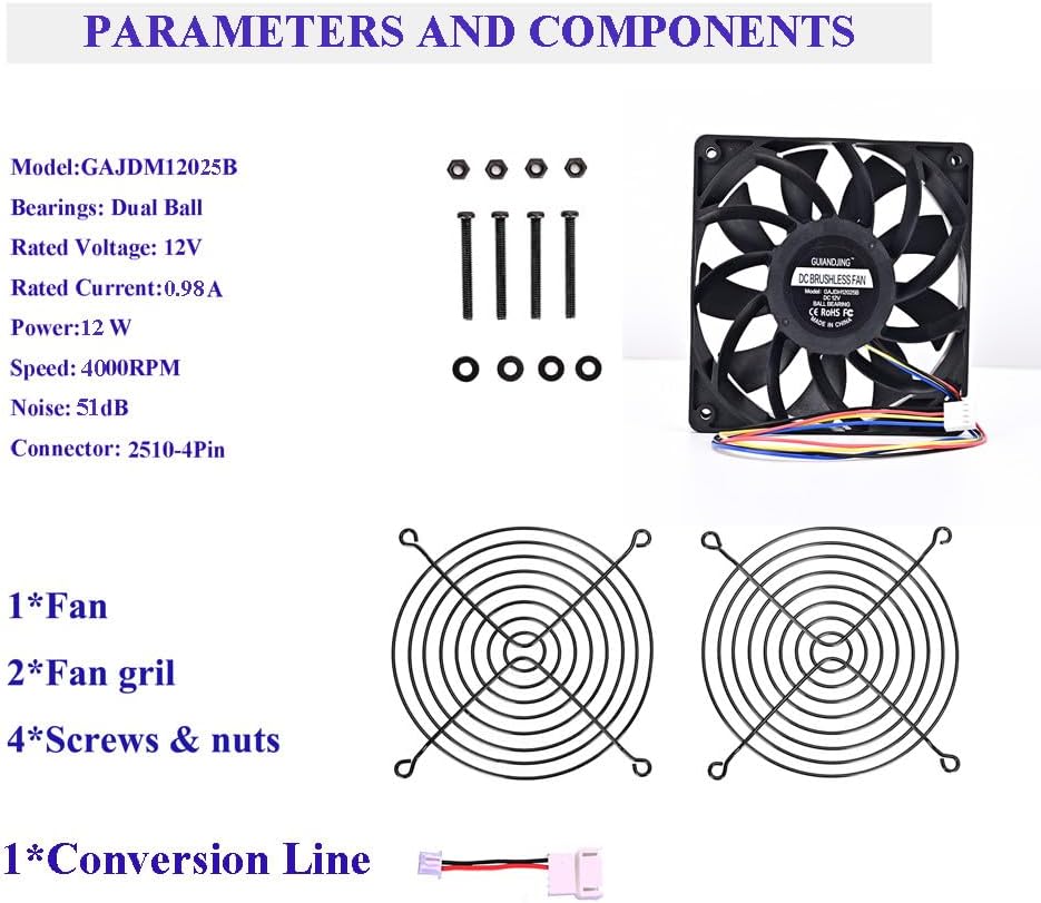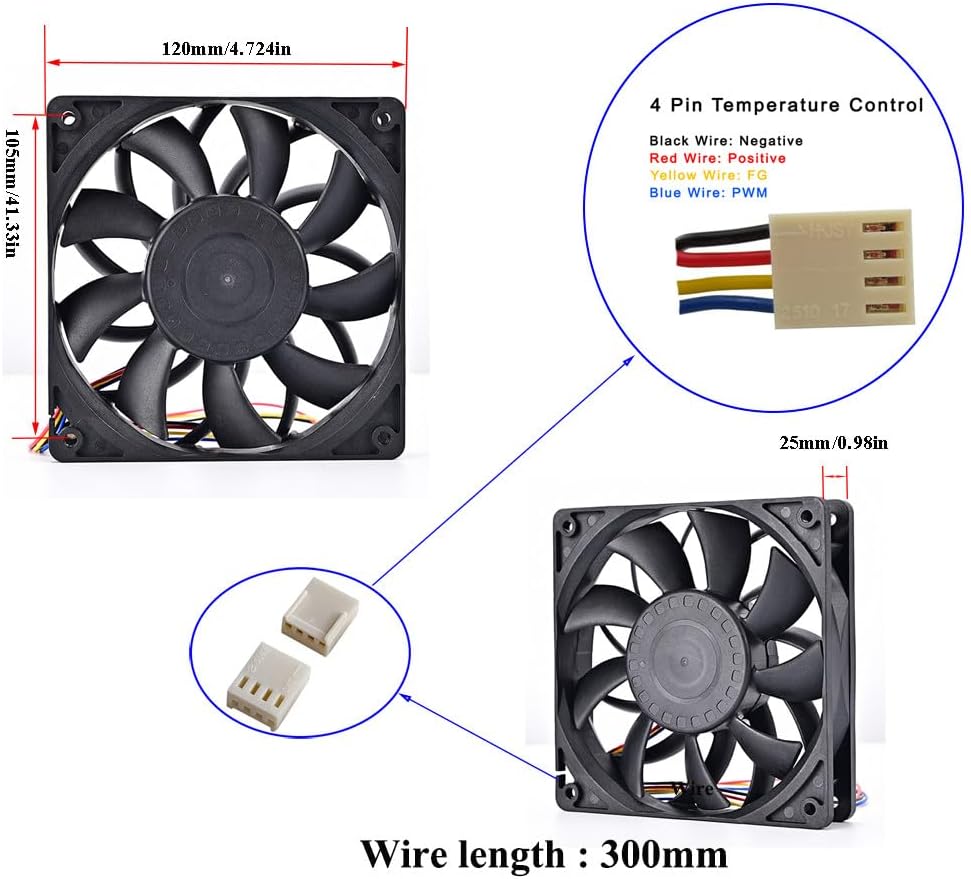 الأبعاد: مروحة 12 سم × 12 سم × 38 مم أو 4.72 بوصة (طول) × 4.72 بوصة (عرض) × 1.5 بوصة (ارتفاع)؛ المسافة بين فتحات التثبيت 105 مم أو 4.13 بوصة؛ الموصل: KF2510 4Pin، السلك الأسود سلبي، السلك الأحمر إيجابي، السلك الأصفر FG، السلك الأزرق PWM، نفس طول الأسلاك 380 مم أو 14.96 بوصة.