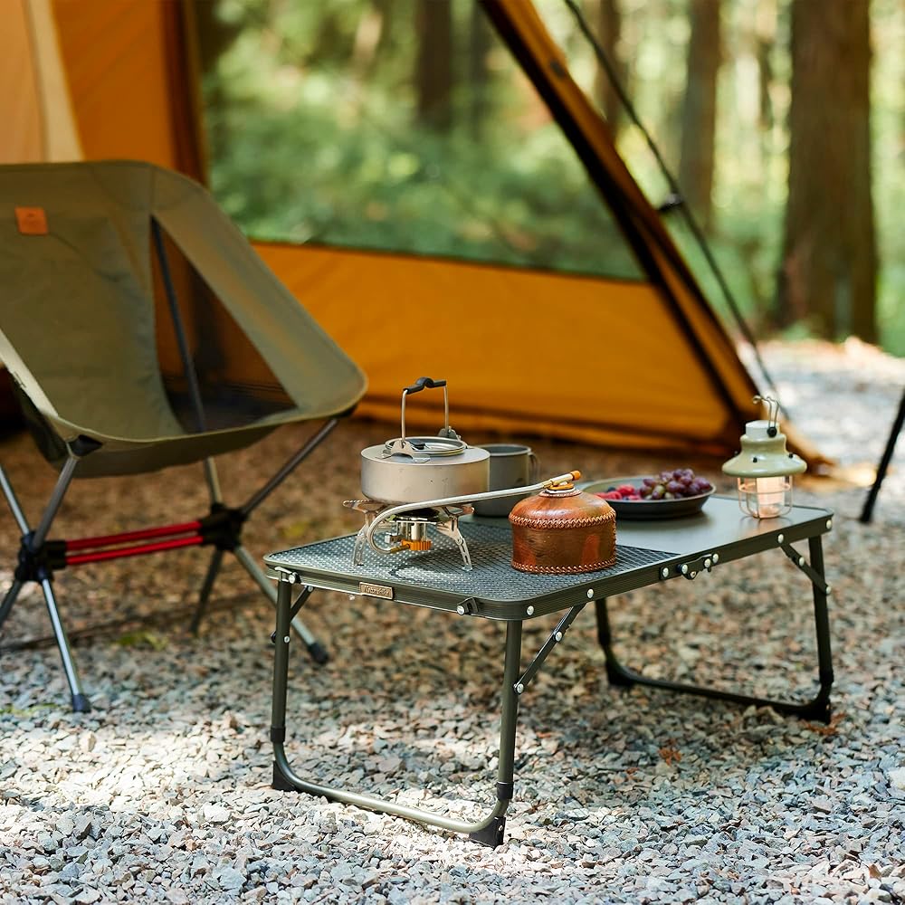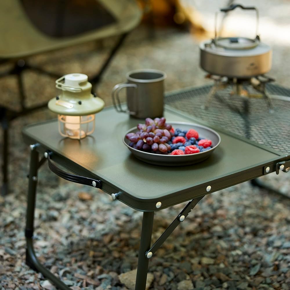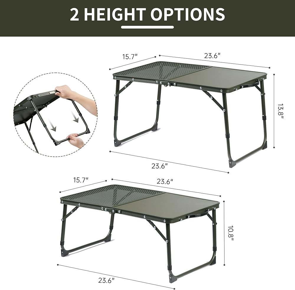 • [تعديل الارتفاع] يمكن تعديل ارتفاع طاولة التخييم القابلة للطي من 10.8 بوصة إلى 13.8 بوصة، حتى تتمكن من اختيار الارتفاع المناسب للجلوس والوقوف. الحجم المفتوح هو 23.6 بوصة × 15.7 بوصة × 10.8 بوصة/13.8 بوصة. دواسات القدم غير القابلة للانزلاق تجعل الطاولة القابلة للطي أكثر استقرارًا.