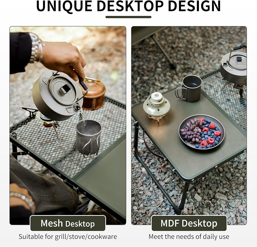 • [هيكل عالي التحمل] طاولة التخييم Naturehike مصنوعة من الألومنيوم المطور بملمس غير لامع، ومقاومة لدرجات الحرارة العالية، ومقاومة للصدأ، ومقاومة للماء. سطح المكتب الشبكي مصنوع من الفولاذ عالي القوة، بينما النصف الآخر مصنوع من MDF السميك.
