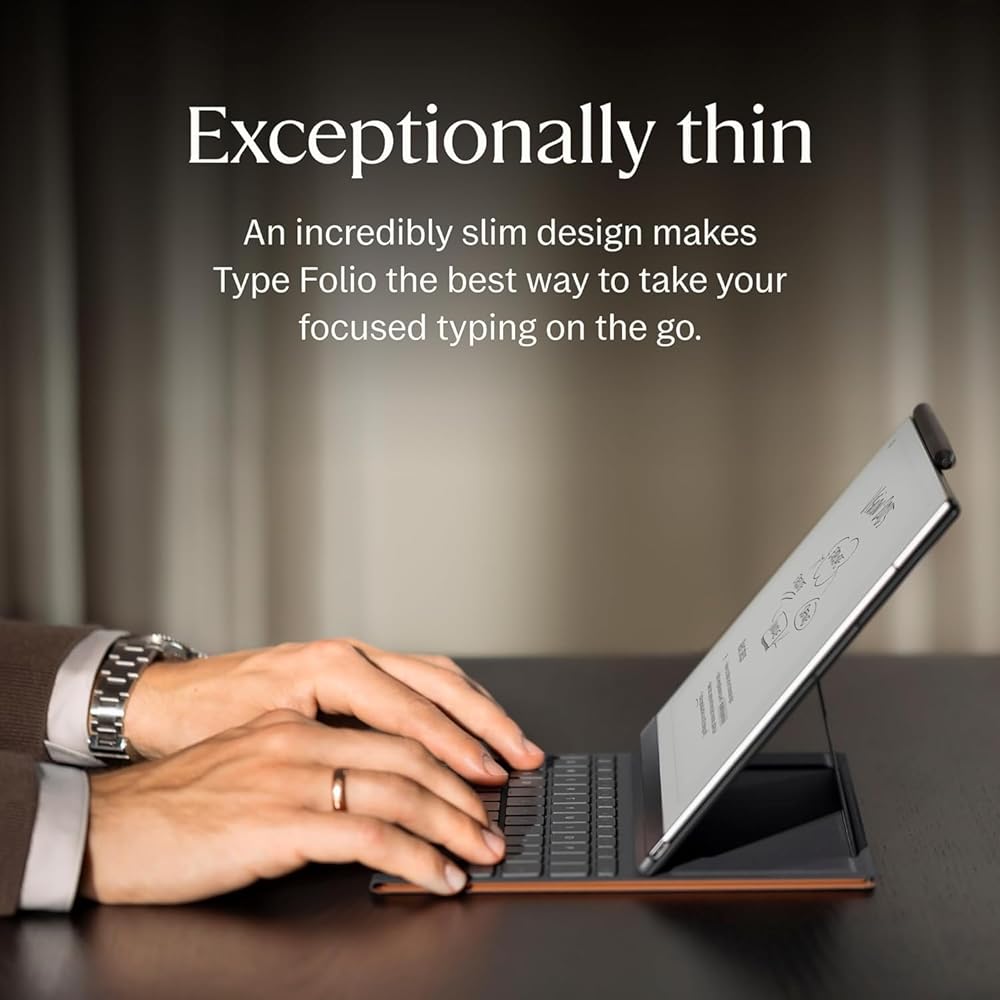 تصميم نحيف ولوحة مفاتيح مخفية بشكل أنيق: أضف كتابة مريحة ومركزة إلى جهازك اللوحي الورقي باستخدام لوحة مفاتيح رفيعة تعمل باللمس. عند عدم الاستخدام، يمكن طي لوحة المفاتيح بشكل أنيق، مما يترك غطاءً أنيقًا لحماية جهازك اللوحي الورقي.