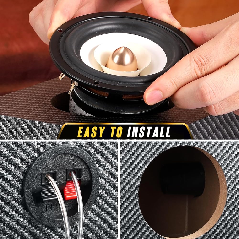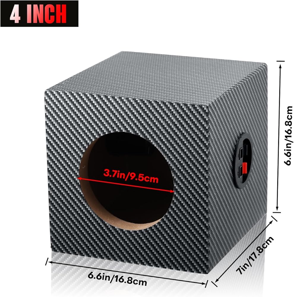 حجم حاوية مكبر الصوت: 4 بوصات حاوية مكبر الصوت (168 مم × 168 مم × 178 مم/ 6.6 بوصة × 6.6 بوصة × 7 بوصة، قطر الثقب: 95 مم / 3.7 بوصة (ملاحظة: يرجى السماح بانحراف بسيط في القياس بسبب القياس اليدوي. ويرجى التحقق من المقاسات من مكبر الصوت الخاص بك قبل الطلب)