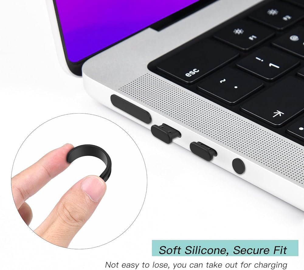 ليس من السهل فقدانها: سدادات الغبار لجهاز MacBook Pro 14 16 مصنوعة من مادة السيليكون الناعمة الممتازة التي لن تضر بمنفذ الشحن بالجهاز، وتصميم محكم الإغلاق يجعلها تبقى في مكانها بشكل آمن ولا تسقط بسهولة. من السهل أيضًا إخراجها للشحن.