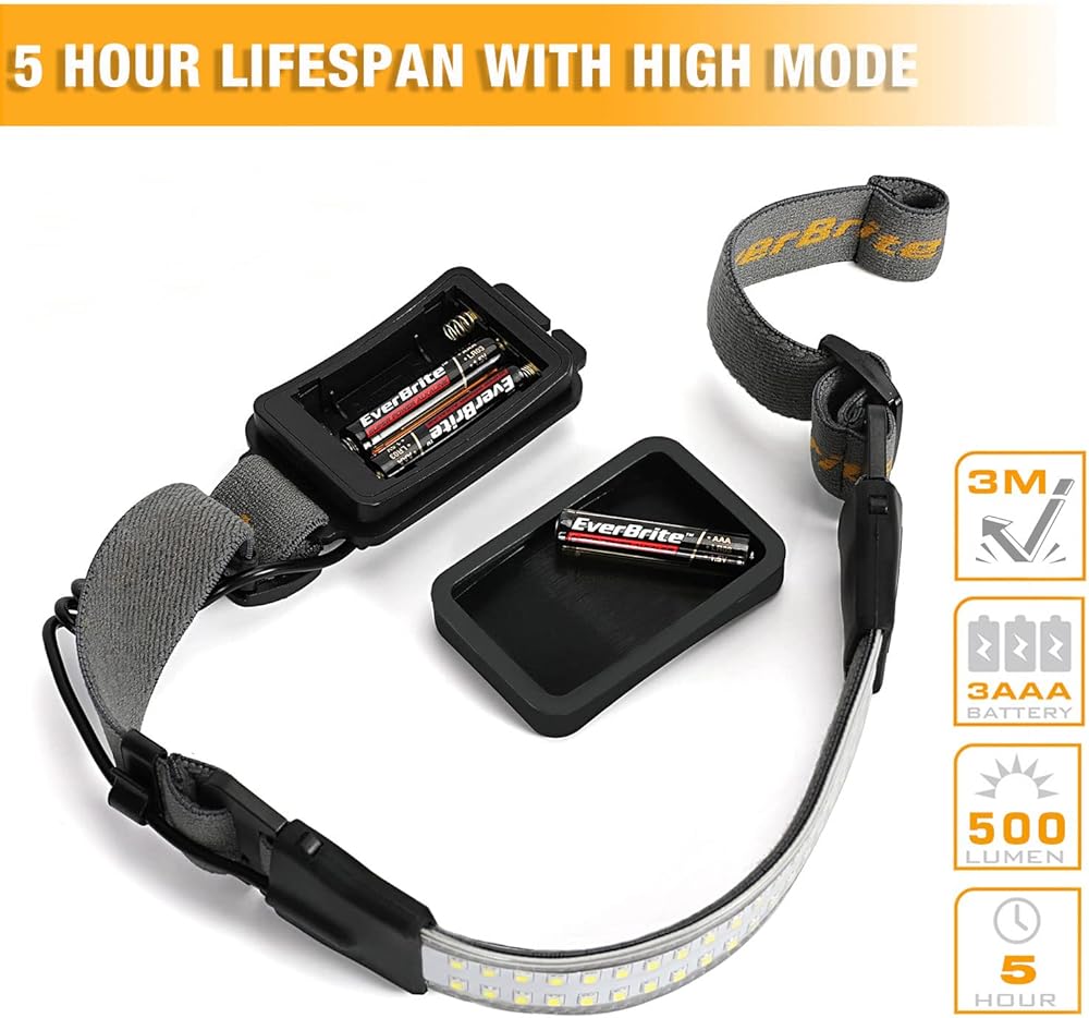 مصباح أمامي EverBrite Widebeam LED، إضاءة عريضة 210 درجة، 500 لومن، 3 أوضاع إضاءة، مثالي للجري والتخييم والمشي لمسافات طويلة، 3 بطاريات AAA