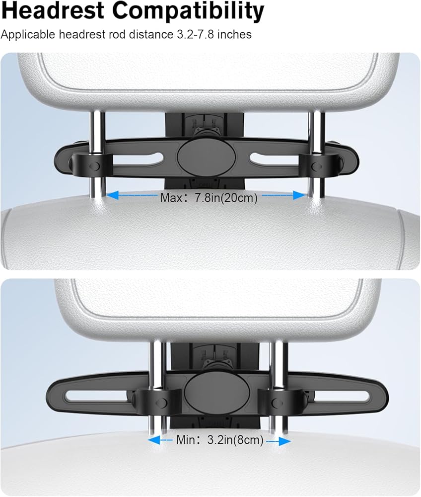 • ❤️Fits More Cars❤️: Tablet holder for car fits 3.3 inches (8.5 cm) to 7.8 inches (20 cm) car headrest bars. It is so stable after installation that it will not move even if your child touches it.