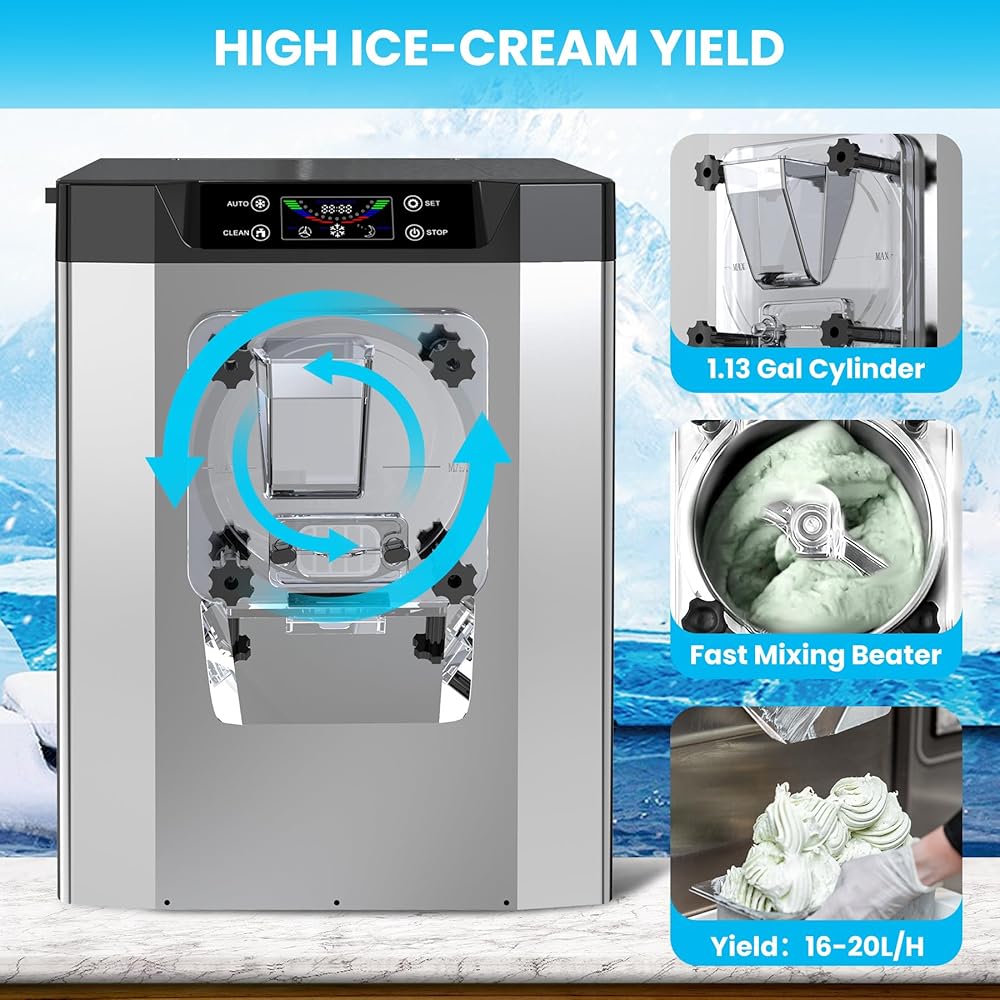 [أداء مثير للإعجاب]: تعمل على 110 فولت 60 هرتز بقوة إجمالية 1400 وات، مدفوعة بضاغط قوي، تتميز ماكينة صنع الآيس كريم هذه بكفاءة استثنائية. بفضل أسطوانة التبريد الكبيرة للغاية وإمكانية التجميد السريع، يمكنها إنتاج ما يصل إلى 16-20 لترًا/4.3-5.3 جالونًا في الساعة من الآيس كريم
