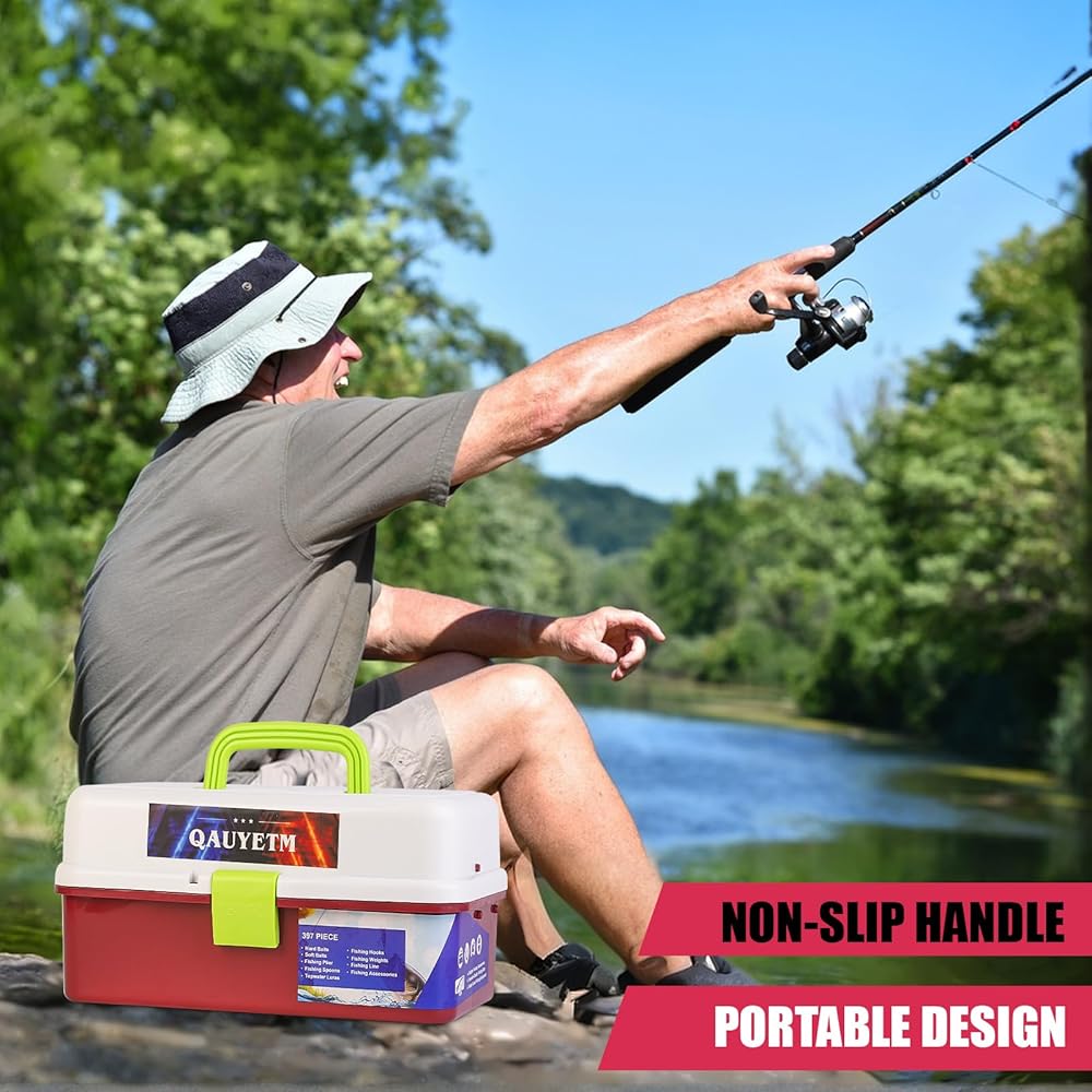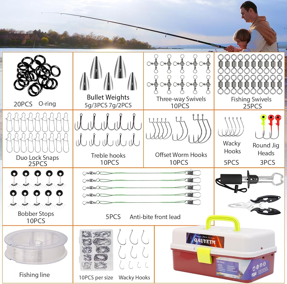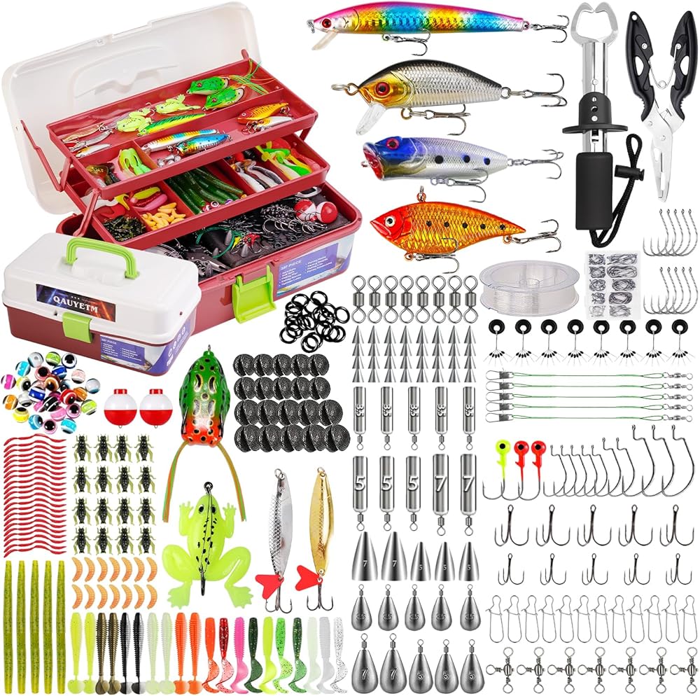 Large 3 Layers Tackle Box Kit: The QAUYETM tackle box contains almost every fishing accessory 397pcs of fishing lures equipment. including: 2 minnows, 2 spoons, 10 treble hooks, 10 paddle tail swimbaits, 10 cruved tail grubs, 20 mealworms, 5 jigs, 4 fish shaped soft baits, 2 soft frogs, 20 fishing beads. From common fishing lures to accessories, this set is a complete set of baits for any angler fishing any water in any season