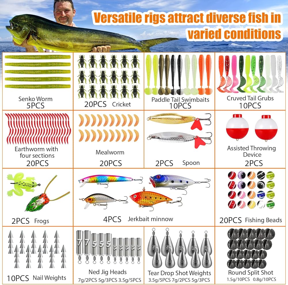 Widely Usage Fishing Kit: Our fishing tackle allows you to fish for almost any type of fish in freshwater, saltwater and other waters, from bass, trout, snook to salmon and more.This fishing accessory has everything you need for fishing scenarios, suitable for boating and fishing in lakes, rivers, reservoirs, ponds and streams. This versatile tackle kit allows you to enjoy fishing in your favourite spot, anytime, anywhere