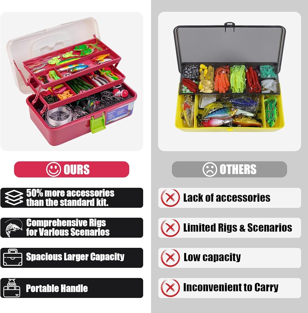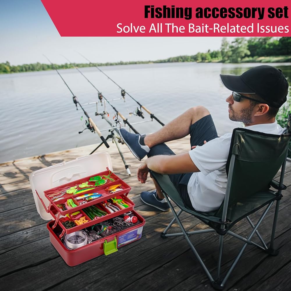 Large Durable Tackle Box: Comes with high quality impact resistant material large 3 layers tackle box with fishing tackle, tackle box stores all your fishing accessories and is easy to carry, making it easy to access the exact lure kit. Durable, secure and waterproof, it is an essential companion for any fishing tri
