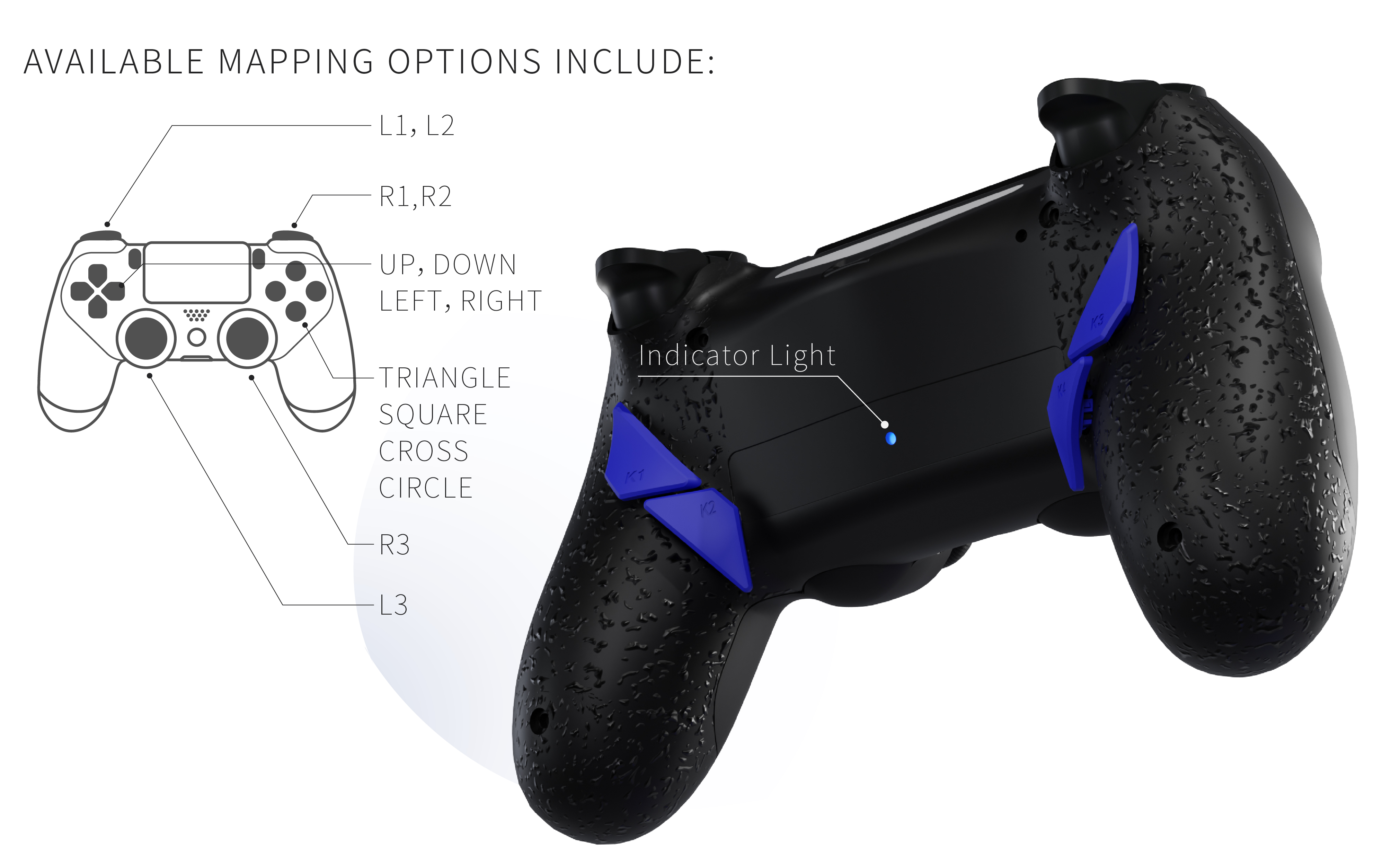 التحكم الخلفي: يمكنك تفعيل برنامج إعادة الخريطة أثناء اللعبة وتعيين 14 زرًا كحد أقصى (X، O، مثلث، مربع، أعلى، أسفل، يسار، يمين، L1، L2، R1، R2، L3، R3) للأزرار الخلفية .