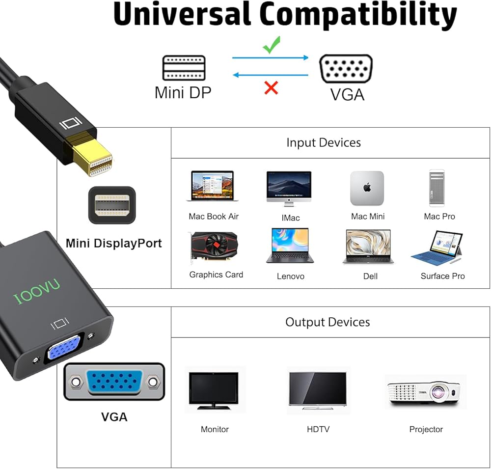 • 【Plug and Play】No driver or any software or driver needed. The mini displayport to VGA adapter supports high video 1080p@60Hz too. If there is any problem to play or others, feel free to contact us to solve problems. (Lifetime Warranty)