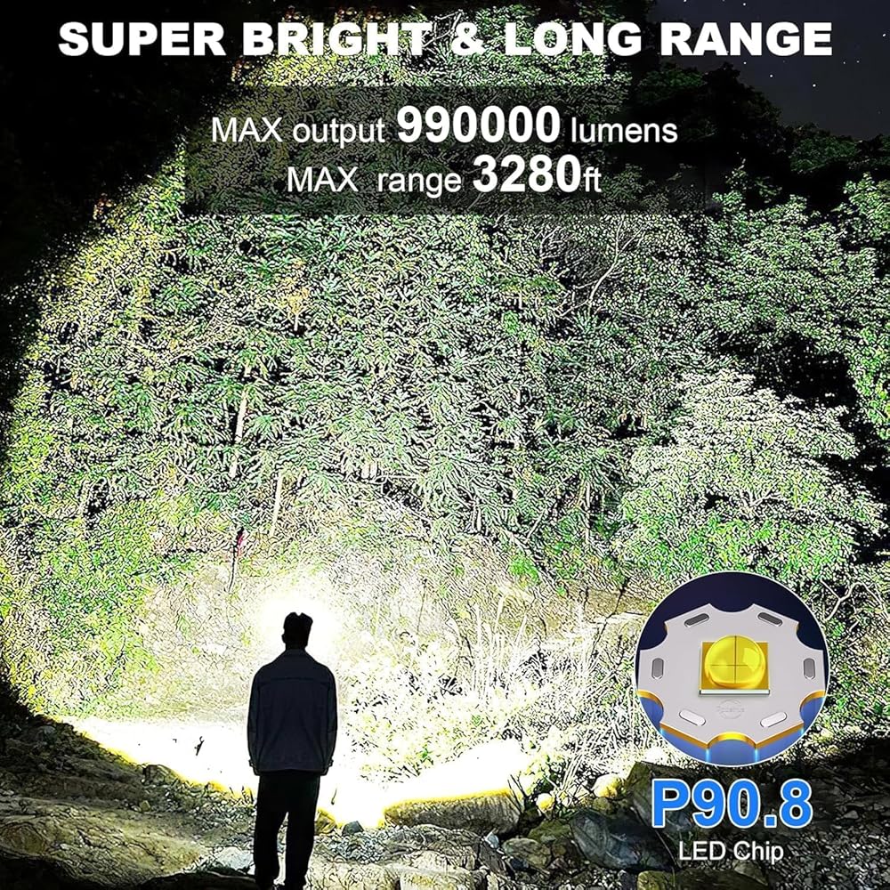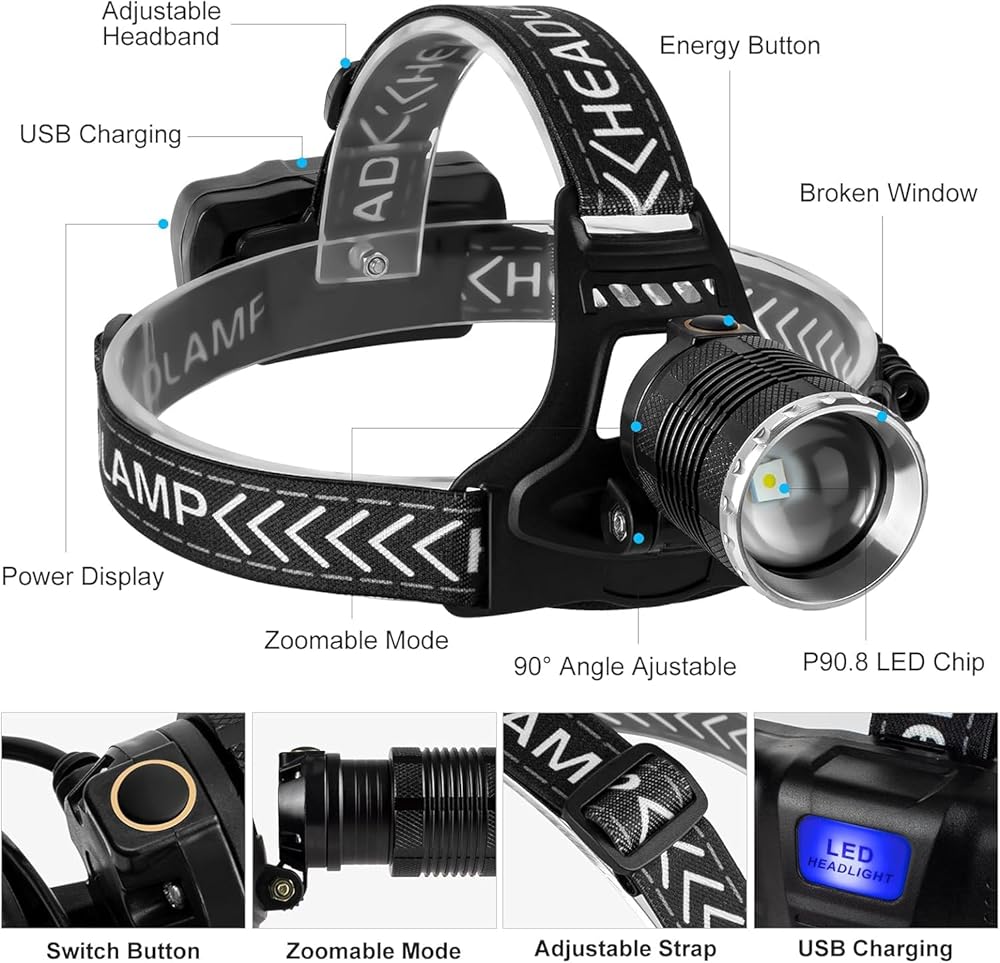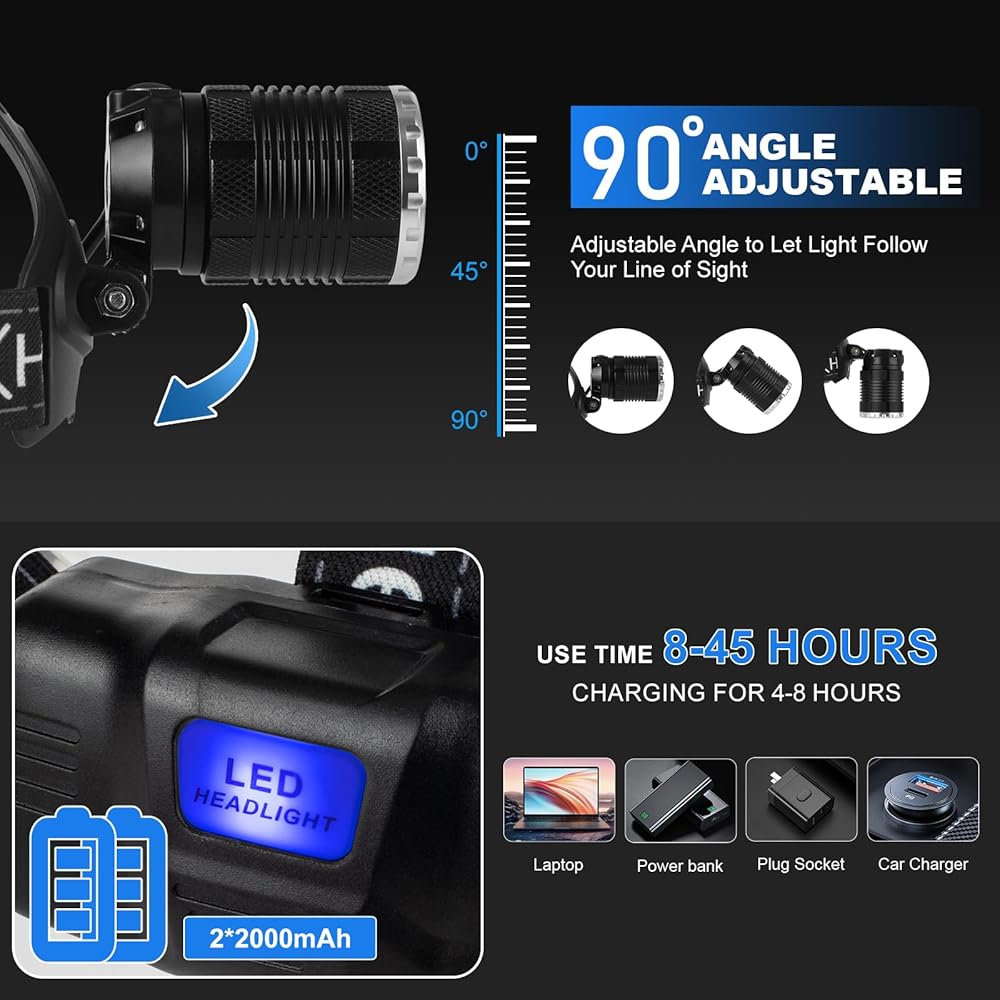 مصباح أمامي LED قابل لإعادة الشحن، مصباح رأس 990000 لومن مع 4 أوضاع، مصباح أمامي تكبير قابل لإعادة الشحن USB، مصابيح رأس قابلة للتعديل 90 درجة قابلة لإعادة الشحن للتخييم في الهواء الطلق، والجري، وركوب الدراجات، والتسلق