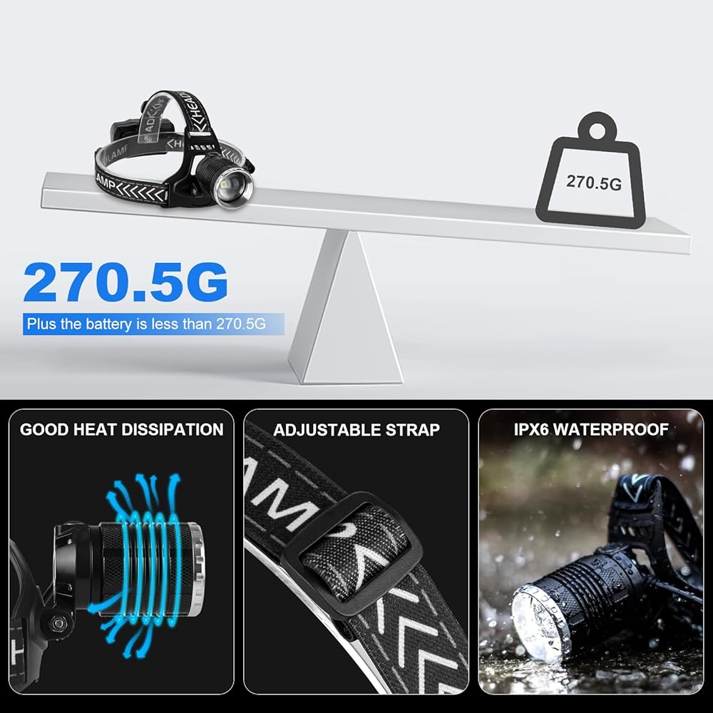• [90 درجة قابلة للتعديل و2*4 أوضاع]--مصباح الرأس مصمم خصيصًا ليكون قابلاً للتعديل 90 درجة، كل درجة صلبة جدًا، مما يسمح لك برؤية نطاق الرؤية الكامل من الأمام إلى الخلف، المصابيح الأمامية للبالغين بها ثلاثة مصابيح الأوضاع: عالية، متوسطة، ستروب، SOS (ضغطة طويلة للتشغيل)، ولكنها تحتوي أيضًا على وضعين للمسافة: شعاع عالٍ وشعاع منخفض. وفقًا للحاجة الفعلية، يمكنك إجراء مجموعة متنوعة من التعديلات، واختيار الوضع الذي يناسب البيئة الحالية.