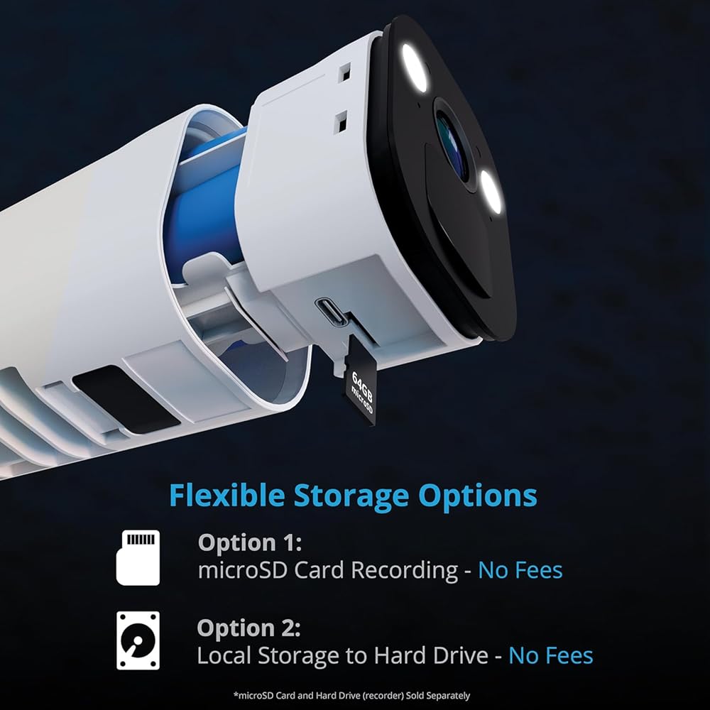 Flexible Storage Options: Easily connect your cameras to a compatible recorder (sold separately) and store the recordings on the hard drive (no fees). Or use the cameras as standalone devices and insert a microSD card (no fees) for storage.