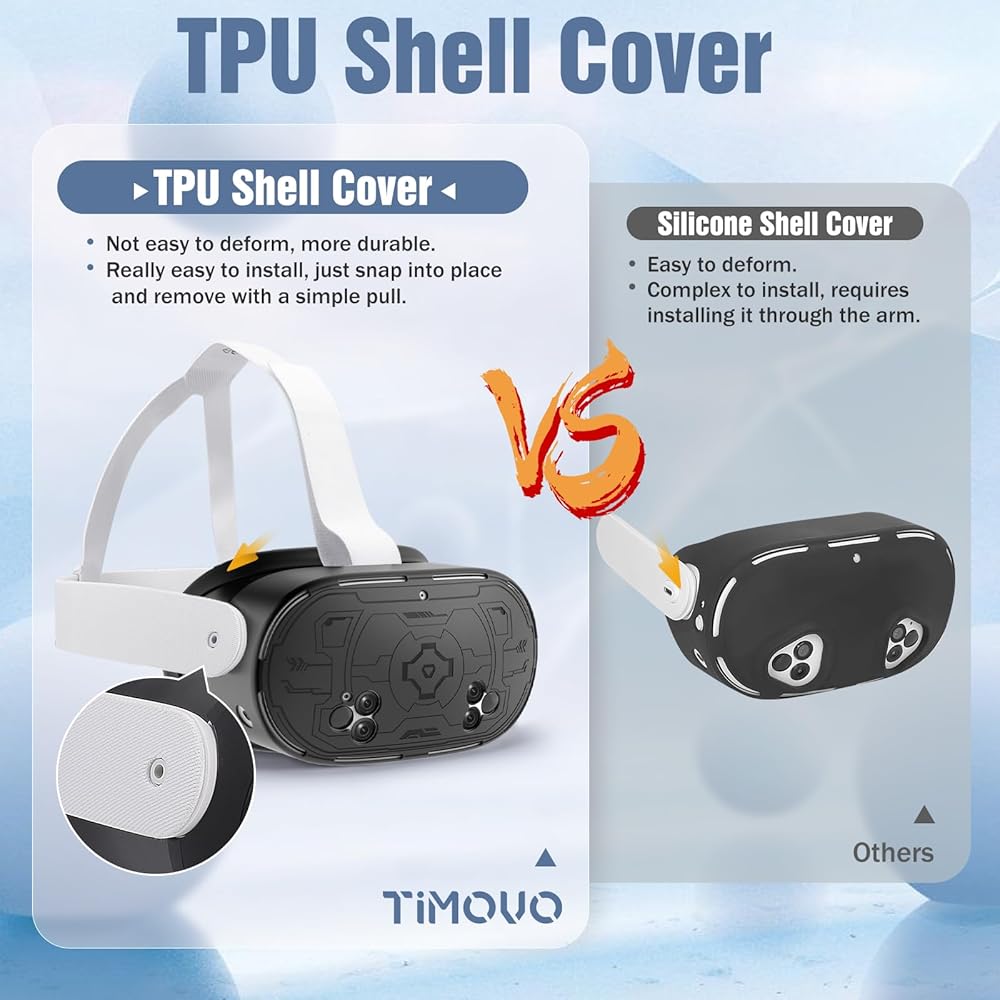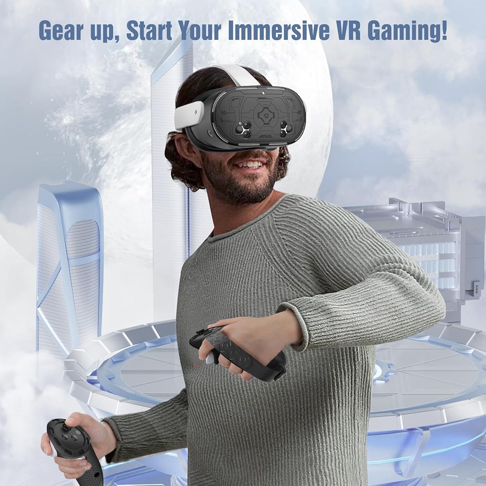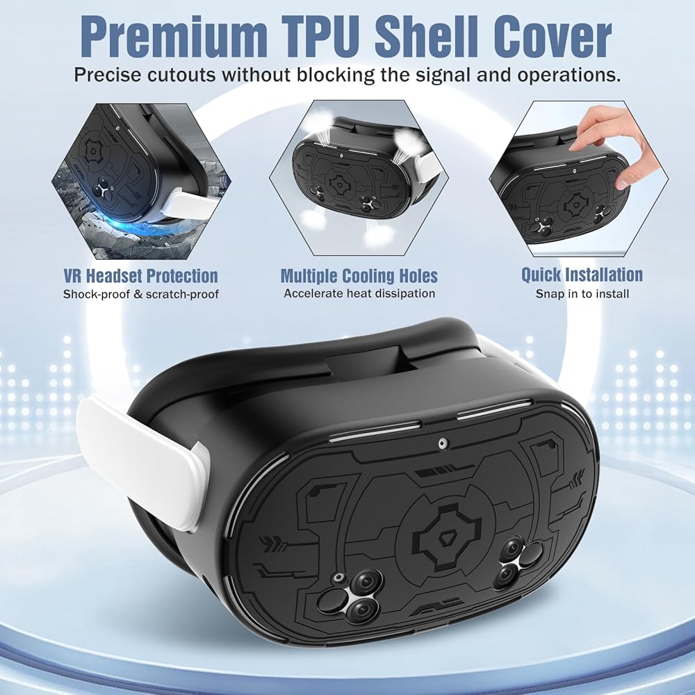غطاء حماية من مادة TPU: مصنوع من مادة TPU القابلة للغسل، ويمكن تثبيته عن طريق تثبيته بلطف. إنه يزيد من القبضة الإضافية بحيث يمكن تثبيته بقوة على سماعة الرأس، مما يوفر حماية أفضل لسماعة الرأس VR من الخدوش؛ مع الخياطة الآلية الحقيقية 1:1، يكون موضع الثقب دقيقًا ولن يؤثر على استخدام الكاميرا وتتبع المستشعر والشحن؛ تعمل فتحات التبريد المتعددة على تسريع تبديد الحرارة لتحسين الأداء.