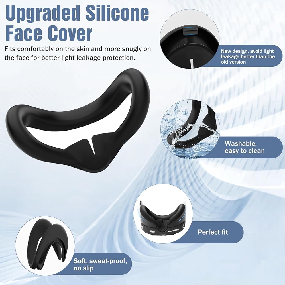 غطاء وجه من السيليكون: غطاء الوجه المطور مصنوع من مادة السيليكون الناعمة، وقد تم تصميم الشكل والحجم وفقًا لمحيط Quest 3S، وهو يتناسب تمامًا مع سماعة الرأس والوجه لتوفير الراحة ومنع تسرب الضوء بشكل أفضل، حتى تتمكن من استمتع بالواقع الافتراضي من منظور أكثر راحة.