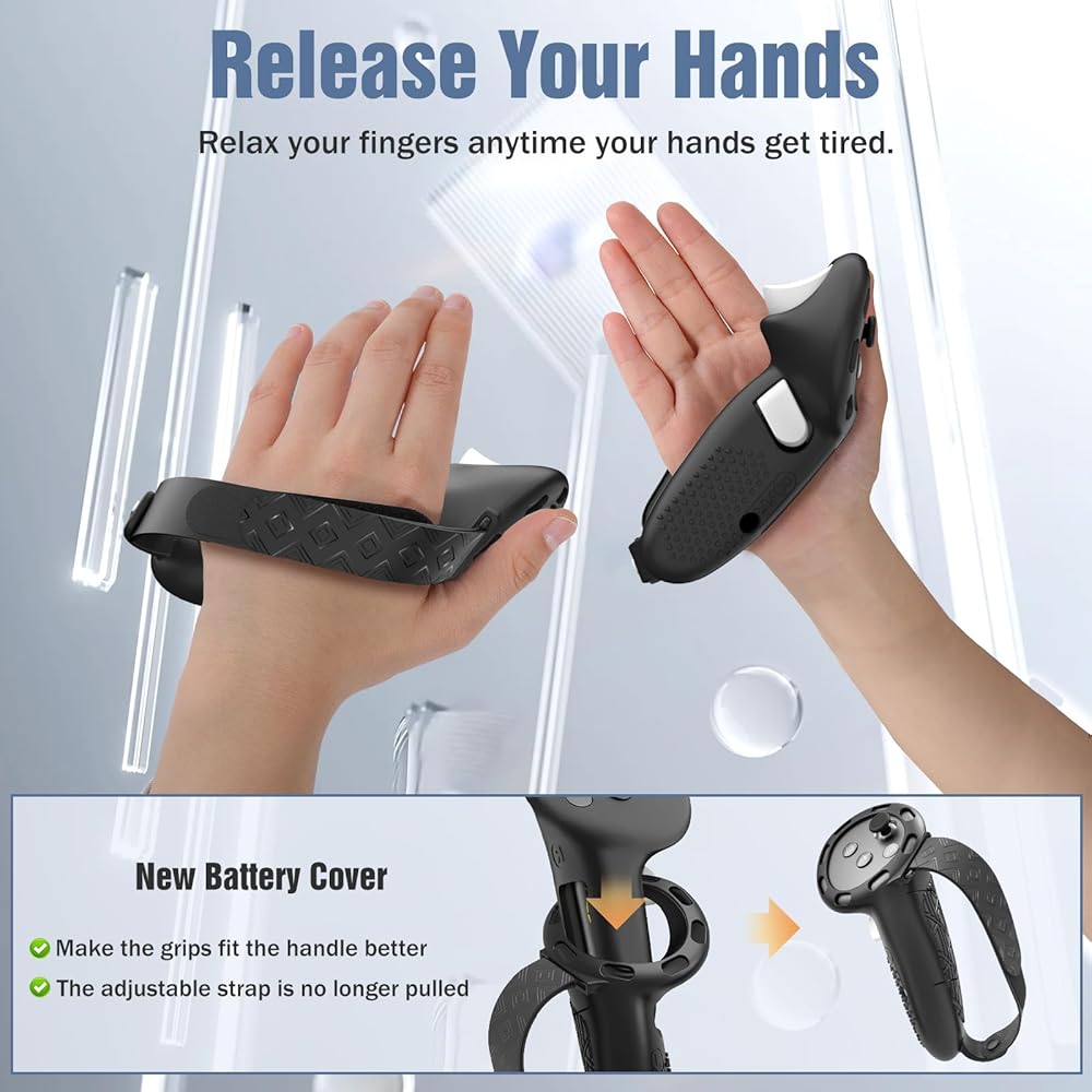 غطاء مقبض من السيليكون للواقع الافتراضي: غطاء المقبض ناعم ومريح، مع نسيج غير قابل للانزلاق يسمح لك بإمساكه بثبات في اليد، ولا تخف من التخلص منه أثناء ألعاب الواقع الافتراضي المثيرة، وحزام جلدي مبطن لتثبيت يدك، مما يوفر أمانًا مزدوجًا ; تصميم الفتحة الدقيق لا يؤثر على التحكم في الزر ونقل الإشارة، مما يمنحك تجربة لعب ممتعة.
