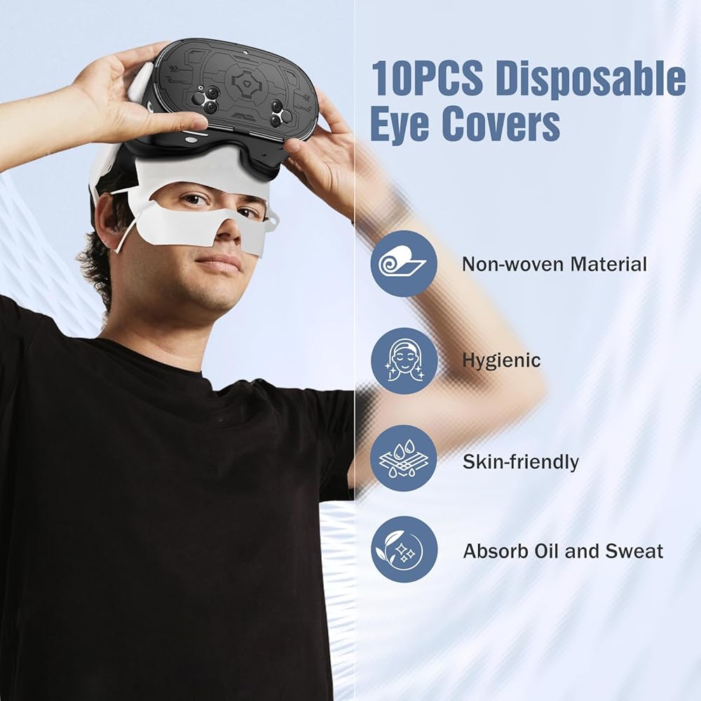 10 قطع من أغطية العين للاستعمال مرة واحدة: تأتي مع 10 أغطية للعين للاستعمال مرة واحدة مصنوعة من مواد غير منسوجة صديقة للبيئة، والتي يمكنها الاتصال مباشرة بالجلد لامتصاص الزيت والعرق، مما يحافظ على جفاف جبهتك وعينيك. يمكن استبدالها في أي وقت من أجل النظافة الشخصية، فلا داعي للقلق بشأن مشاركة سماعة الواقع الافتراضي مع الآخرين.