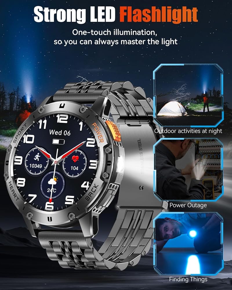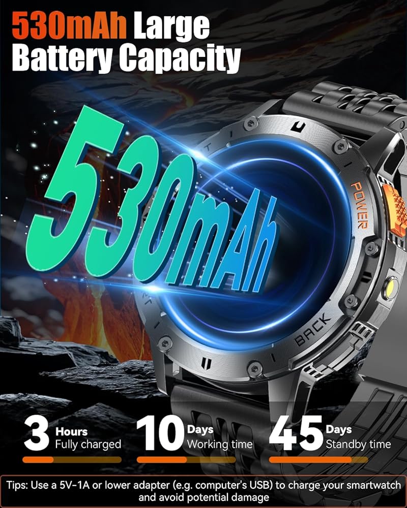 【بطارية 530 مللي أمبير في الساعة ومصباح يدوي مدمج】 مجهزة ببطارية من الدرجة العسكرية 530 مللي أمبير في الساعة، توفر هذه الساعة الذكية 5-10 أيام من الاستخدام وما يصل إلى 45 يومًا من الاستعداد بعد 2-3 ساعات فقط من الشحن. كما أنها تحتوي على مصباح يدوي مدمج، مما يجعلها أداة أساسية للتخييم والمشي لمسافات طويلة والأنشطة الليلية. سواء كنت في حالة طوارئ أو تحتاج إلى ضوء إضافي أثناء مشاكل السيارة، تضمن لك هذه الساعة الذكية أنك مستعد دائمًا.
