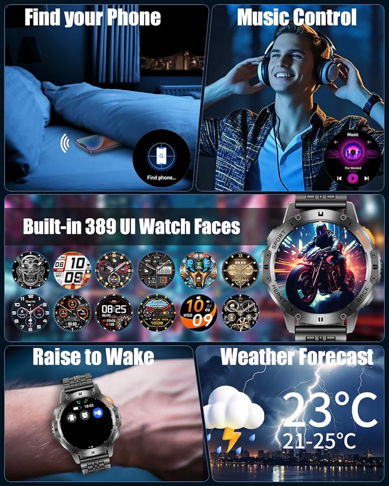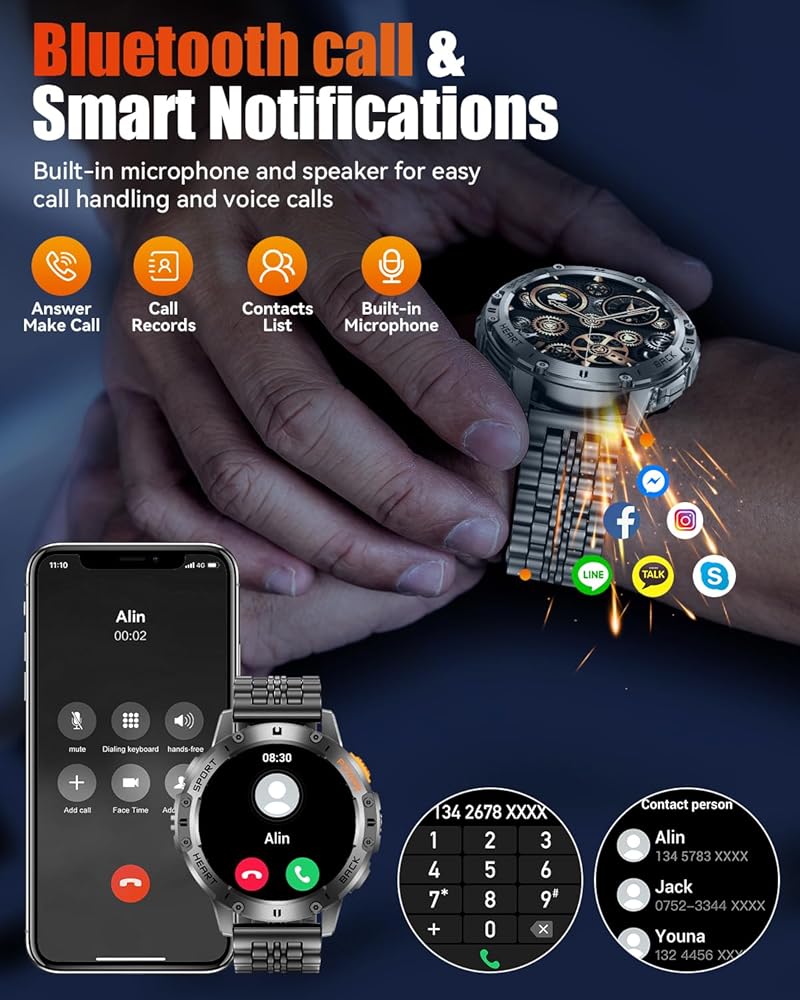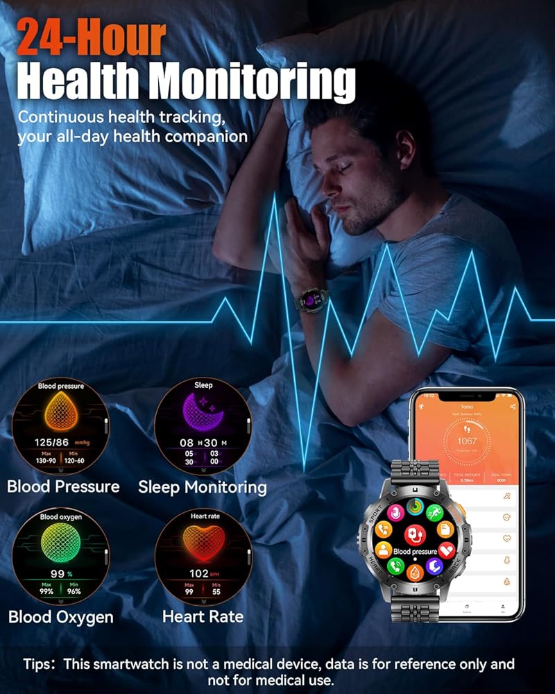 【متانة من الدرجة العسكرية ومقاومة للماء IP68】 هذه الساعة الذكية من الدرجة العسكرية مصممة لتحمل أصعب البيئات، ومصممة لدرجات الحرارة القصوى ومقاومة الغبار ورذاذ الملح، وتضمن المتانة ضد الصدمات والماء والغبار. مع تصنيف IP68 لمقاومة الماء، فهو مثالي للاستخدام اليومي مثل غسل اليدين أو الاستحمام أو المشي لمسافات طويلة ممطرة، مما يجعله رفيقًا موثوقًا به لكل من المغامرات الخارجية وظروف العمل القاسية.