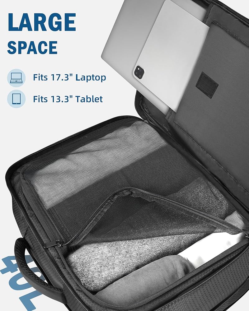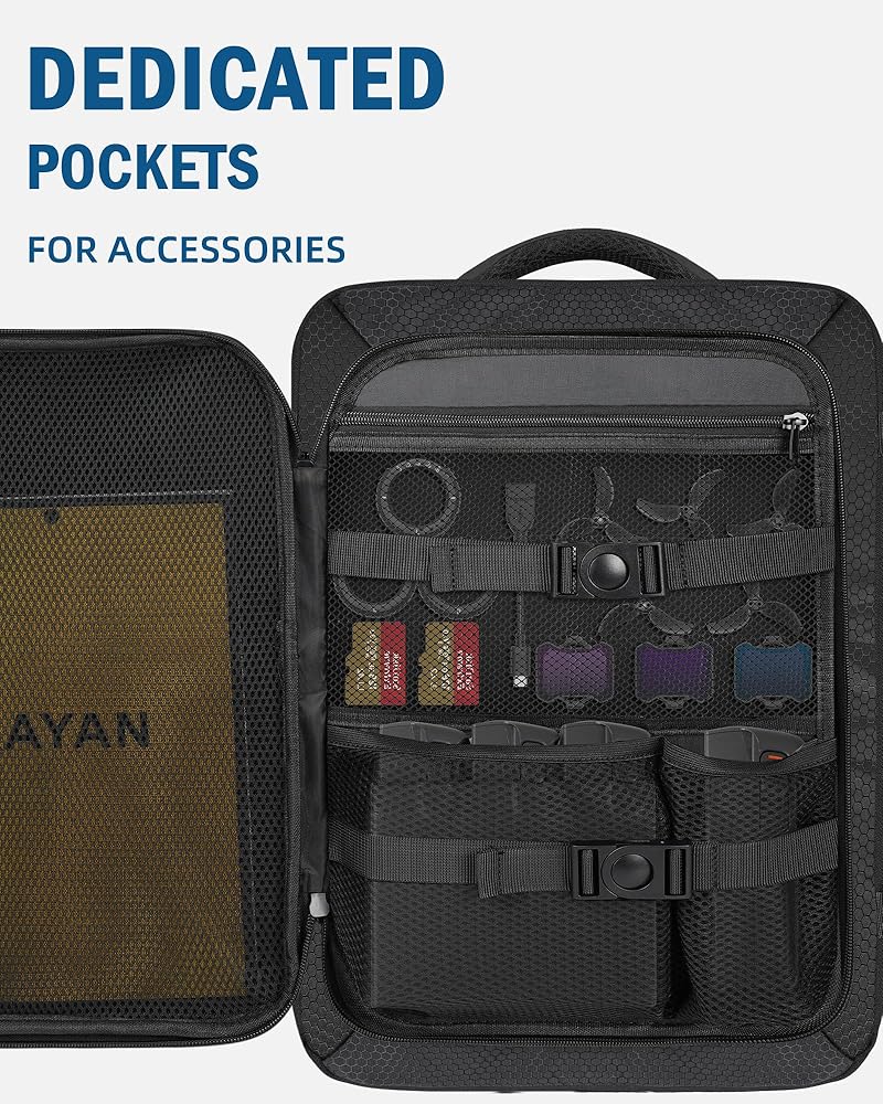 • EXPANDABLE LARGE CAPACITY: The Avata 2 case has an expandable compartment for ample capacity. Unzip to get 40 L storage, the main room can fit a camera, clothes, and travel items for a short trip. The suitcase-style opening makes it easy to remove clothing without wrinkling. The tech compartment accommodates a 17.3-inch laptop and a 13.3-inch iPad. A hidden pocket on the back stores items like a passport or a wallet for quick access, while the side pocket conveniently holds a water bottle.