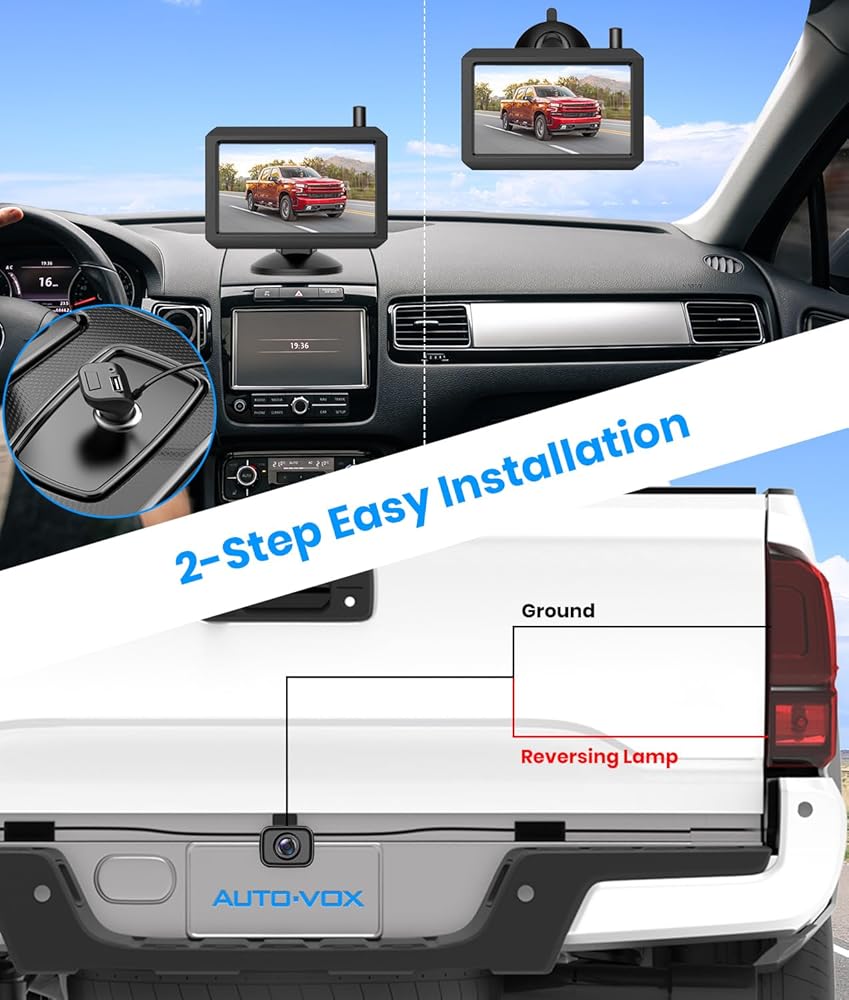 كاميرا احتياطية لاسلكية AUTO-VOX بشاشة 5 بوصة عالية الدقة، نظام كاميرا الرؤية الخلفية للإشارة الرقمية الثابتة سهل التركيب، كاميرا احتياطية للرؤية الليلية ذات قناة مزدوجة اللون لسيارة SUV بيك اب شاحنة فان - W7Pro