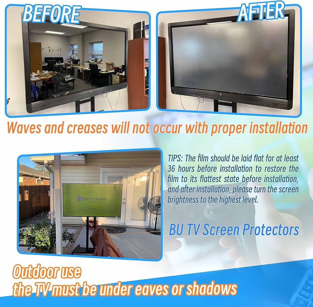 نصائح: الاستخدام الداخلي والخارجي يرجى تجنب ضوء الشمس المباشر على شاشة التلفزيون، بعد التثبيت، اضبط سطوع الشاشة والمعلمات الأخرى يمكن أن تقلل من الوهج