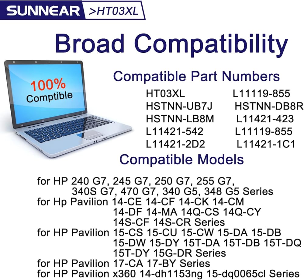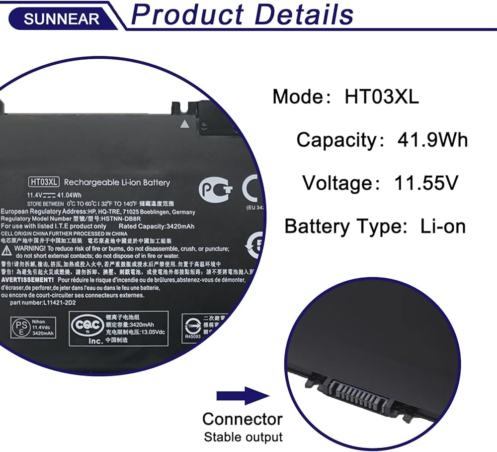 المواصفات: الموديل: HT03XL الجهد: 11.55 فولت السعة: 51 وات/4195 مللي أمبير في الساعة نوع البطارية: ليثيوم أيون. عمر البطارية: ما يصل إلى 500 دورة شحن طوال عمر البطارية. يأتي أيضًا مع أدوات التثبيت.