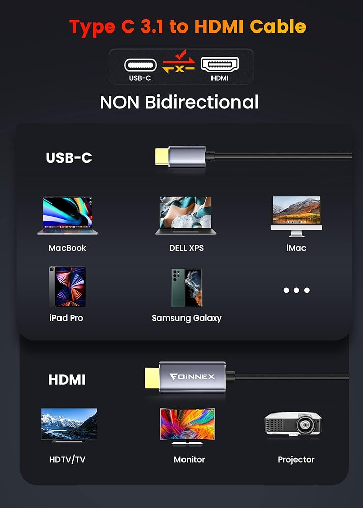 • 【توافق واسع】النوع C إلى HDMI متوافق مع Macbook Air/Mac Mini، 2015/2016/2017/2018 MacBook 12 بوصة/13 بوصة/15 بوصة، 2016/2017/2018MacBook Pro، Dell XPS12(9250)/Dell XPS13/Dell XPS15/ديل Precision5510، لينوف 900/910/920، Samsung s9/s8/s10 Plus،/Note8/Note 9، Huawei MateBook، Huawei P20/P30، Mate 20/10 Pro (لا يدعم Huawei P20/30 lite Mate 20/10 lite) وأجهزة الكمبيوتر المحمولة الأخرى مع منفذ USB 3.1 القياسي